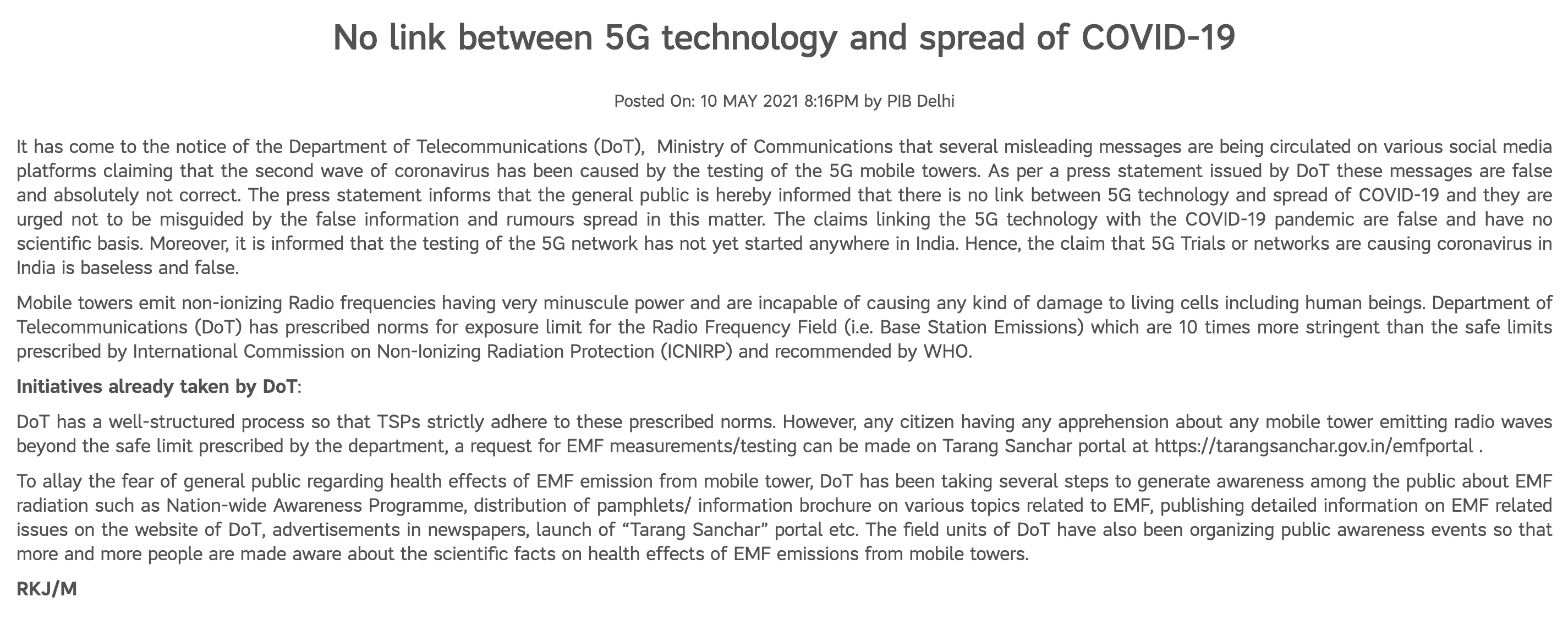 ឥណ្ឌា៖ កាលពីពេលថ្មីៗនេះមានដំណឹងក្រៅផ្លូវការជាច្រើនត្រូវបានគេយកទៅផ្សព្វផ្សាយពេញបណ្តាញសង្គមក្នុងប្រទេសឥណ្ឌាដោយបានអះអាងថា ការរាតត្បាតជំងឺកូវីដ ១៩ ដែលជារលកទី ២ នៅក្នុងប្រទេសឥណ្ឌានាពេលបច្ចុប្បន្ននេះគឺកើតឡើងបណ្តាលមកពីរដ្ឋាភិបាលឥណ្ឌាកំពុងធ្វើតេស្តសាកល្បងអ៊ីនធឺណិតល្បឿន 5G។ ប្រភពក្រៅផ្លូវការនេះបានលើកឡើងថា នៅពេលរដ្ឋាភិបាលឥណ្ឌាចាប់ផ្តើមដំឡើងដងអង់តែនទូរស័ព្ទធំៗជាច្រើនសម្រាប់ធ្វើតេស្តសាកល្បងអ៊ីនធឺណិតល្បឿន 5G នោះគឺវាបានបង្កើតឲ្យមានជាតិវិទ្យុសកម្មយ៉ាងច្រើននៅក្នុងបរិយកាស ហើយជាតិវិទ្យុសកម្មនោះបានធ្វើប្រព័ន្ធការពាររាងកាយពលរដ្ឋឥណ្ឌាចុះខ្សោយនិងងាយឆ្លងជំងឺកូវីដ ១៩តែម្តង។