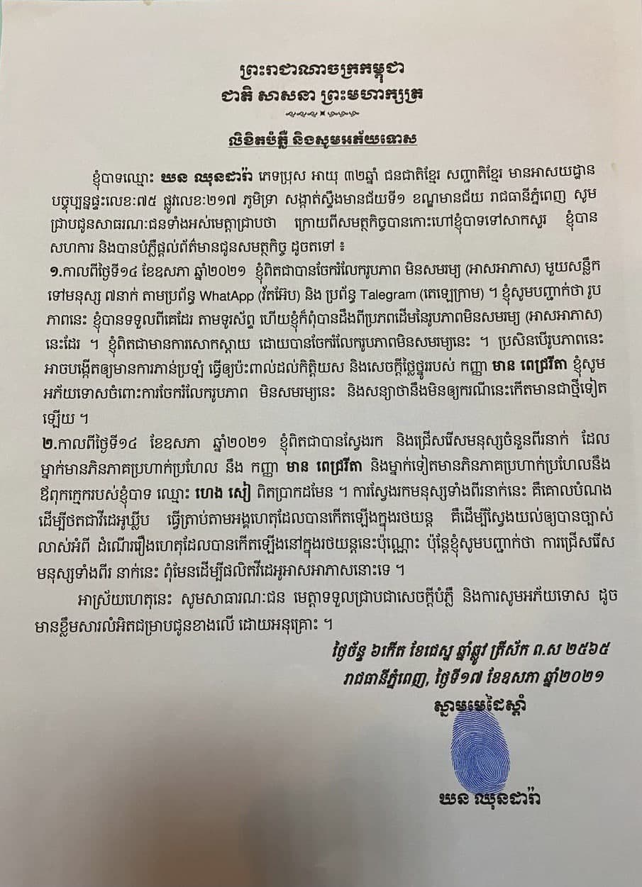 ឧកញ៉ា ឃន ឈុនដារ៉ា កូនប្រសារឧកញ៉ា ហេង សៀ ធ្វើលិខិតសុំទោសជាសាធារណៈ និងទទួលស្គាល់ថាជួលមនុស្ស២នាក់មែន តែដើម្បីថតឃ្លីបធ្វើត្រាប់ហេតុការណ៍ដែលកើតឡើងក្នុងរថយន្តប៉ុណ្ណោះ