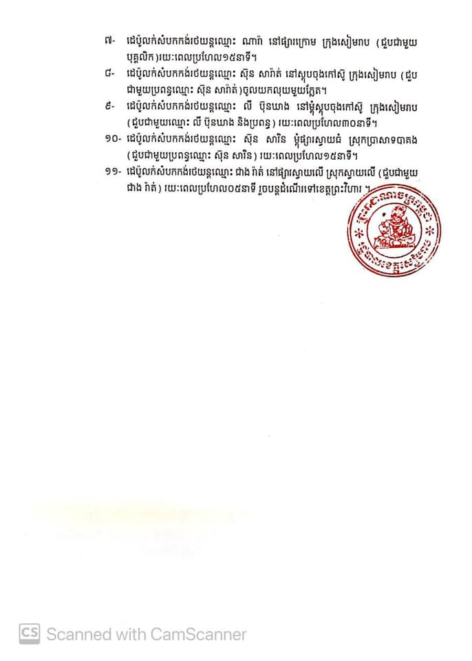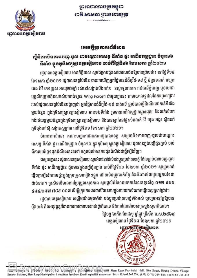 ចំពោះករណីនេះ គណៈបញ្ជាការឯកភាពរដ្ឋបាលខេត្ត សម្រេចបិទការចេញ-ចូលជាបណ្ដោះអាសន្ន ទីតាំង ផ្ទះ អាជីវកម្មដ្ឋាន ចំនួន១៦ក្នុងភូមិសាស្រ្តខេត្តសៀមរាប ដូចមានក្នុងបញ្ជីជូនភ្ជាប់ ចាប់ពីកាលបរិច្ឆេទជូនដំណឹងនេះតទៅ រហូតដល់មានការជូនដំណឹងជាថ្មីឡើងវិញ។