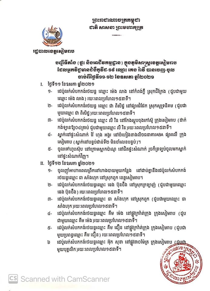 ជាមួយគ្នានេះ រដ្ឋបាលខេត្តសៀមរាប សូមអំពាវនាវដល់បងប្អូនប្រជាពលរដ្ឋ ដែលធ្លាប់បានចេញ-ចូលទីតាំង ផ្ទះ អាជីវកម្មដ្ឋាន ដូចមានក្នុងបញ្ជីជូនភ្ជាប់ ចាប់ពីថ្ងៃទី១១ ខែឧសភា ឆ្នាំ២០២១ សូមរួសរាន់ធ្វើចត្តាឡីស័កតាមផ្ទះក្នុងក្រុមគ្រួសាររៀងៗខ្លួន ដោយមិនត្រូវពាក់ព័ន្ធ និងប៉ះពាល់ជាមួយអ្នកដទៃជាដាច់ខាត។ ប្រសិនបើមានការប្រែប្រួលសុខភាព សូមផ្តល់ព័ត៌មានមកកាន់លេខទូរស័ព្ទ ០១២ ៩៥៥ ៤៧៤/០៧៧ ៧៨៩ ០០៧ ដើម្បីក្រុមការងារចាត់វិធានការក្នុងការយកសំណាកធ្វើតេស្តស្រាវជ្រាវ។