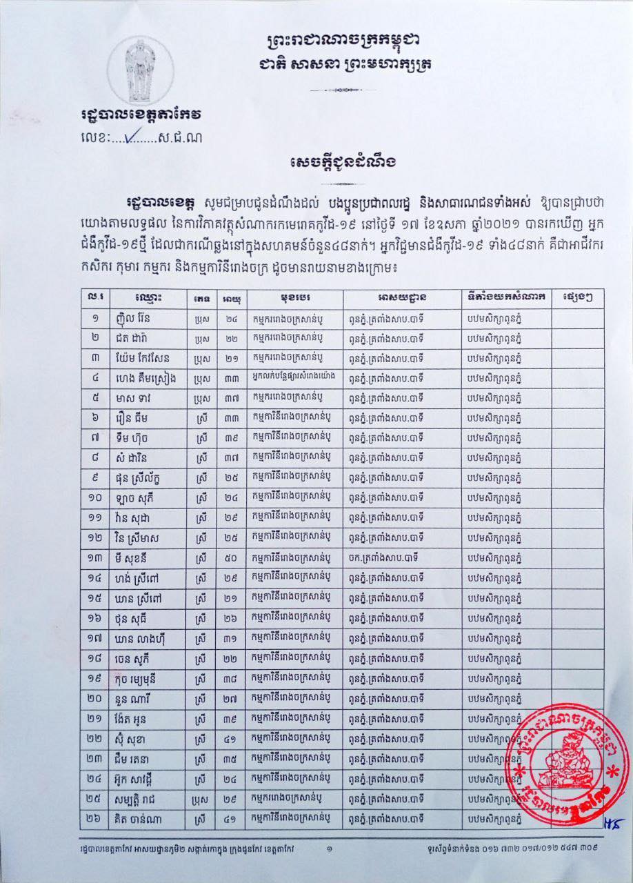 ខេត្តតាកែវ រកឃើញអ្នកវិជ្ជមានជំងឺកូវីដ១៩ថ្មីចំនួន ៤៨នាក់បន្ថែមទៀត ក្នុងនោះភាគច្រើនជាកម្មករ-កម្មការិនីរោងចក្រ សាន់បូ