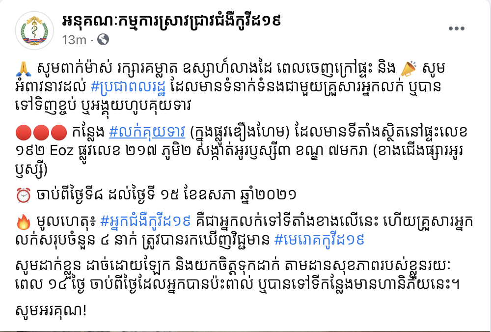 យោងតាមការបញ្ជាក់ពី អនុគណៈកម្មការស្រាវជ្រាវជំងឺកូវីដ១៩ បានឲ្យដឹងថា សូមពាក់ម៉ាស់ រក្សារគម្លាត ឧស្សាហ៍លាងដៃ ពេលចេញក្រៅផ្ទះ និងសូមអំពាវនាវដល់ប្រជាពលរដ្ឋ ដែលមានទំនាក់ទំនងជាមួយគ្រួសារអ្នកលក់ ឬបានទៅទិញខ្ចប់ ឬអង្គុយហូបគុយទាវ នៅកន្លែងលក់គុយទាវ (ក្នុងផ្លូវឌឿងហែម) ដែលមានទីតាំងស្ថិតនៅផ្ទះលេខ ១៩២ Eoz ផ្លូវលេខ ២១៧ ភូមិ២ សង្កាត់អូរឫស្សី៣ ខណ្ឌ ៧មករា (ខាងជើងផ្សារអូរឫស្សី) ចាប់ពីថ្ងៃទី៨ ដល់ថ្ងៃទី ១៥ ខែឧសភា ឆ្នាំ២០២១ ដោយមូលហេតុ អ្នកជំងឺកូវីដ១៩ គឺជាអ្នកលក់ទៅទីតាំងខាងលើនេះ ហើយគ្រួសារអ្នកលក់សរុបចំនួន ៤ នាក់ ត្រូវបានរកឃើញវិជ្ជមានមេរោគកូវីដ១៩។