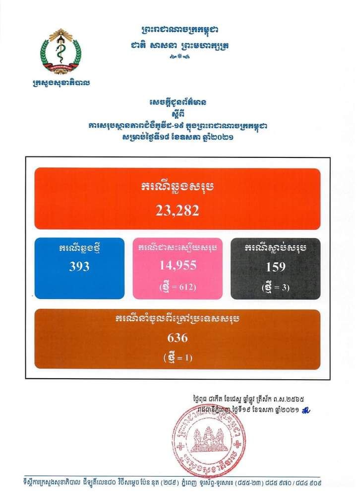 នៅថ្ងៃទី១៩ ខែឧសភា ឆ្នាំ២០២១នេះ ក្រសួងសុខាភិបាលកម្ពុជា បានចេញសេចក្តីជូនដំណឹងពី ការរកឃើញករណីវិជ្ជមានវីរុសកូវីដ១៩ថ្មី ៣៩៣ចំនួន នាក់ ខណៈអ្នកបានជាសះស្បើយថ្មីមានចំនួន ៦១២នាក់ និងមានអ្នកបាត់បង់ជីវិត០៣នាក់។ គិតមកទល់ពេលនេះ ករណីឆ្លងកូវីដ១៩ សរុបនៅក្នុងប្រទេសកម្ពុជា មានចំនួន ២៣,២៨២នាក់, ករណីជាសះស្បើយសរុប ១៤,៩៥៥នាក់ និងស្លាប់សរុប ១៥៩នាក់៕