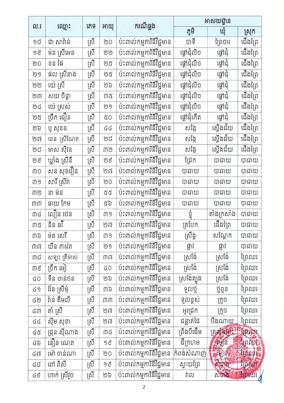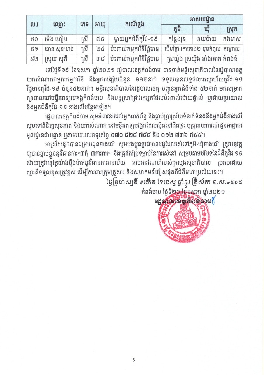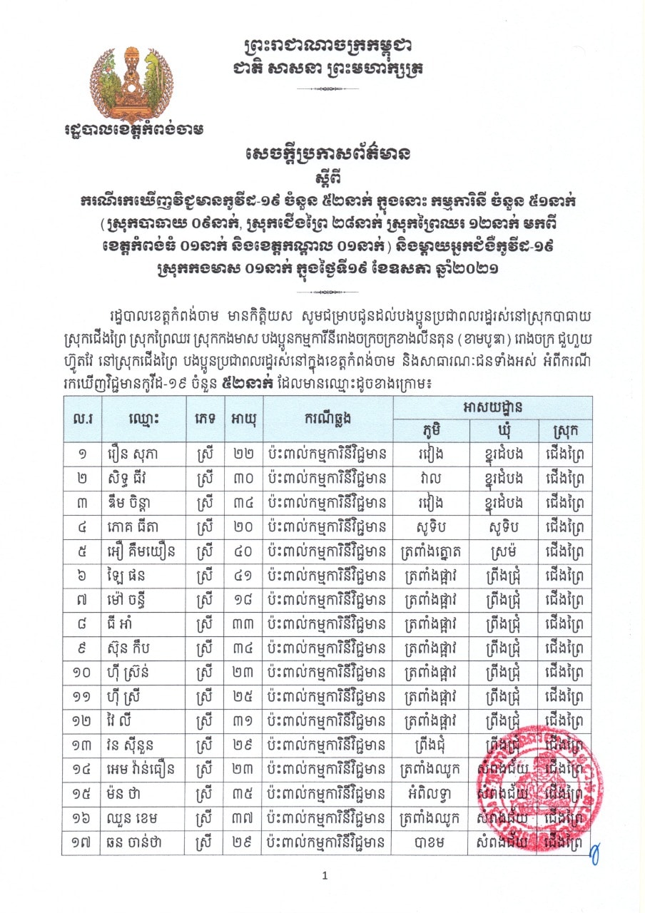 យោងតាមសេចក្តីប្រកាសព័ត៌មានរបស់រដ្ឋបាលខេត្តកំពង់ចាម បានជម្រាបជូនដល់បងប្អូនប្រជាពលរដ្ឋរស់នៅស្រុកបាធាយ ស្រុកជើងព្រៃ ស្រុកព្រៃឈរ ស្រុកកងមាស បងប្អូនកម្មករ-កម្មការិនីរោងចក្រ ខាងលីនតុន (ខាមបូឌា) រោងចក្រ ជួហួយ ហ្វ៊ូតវវែ ក្នុងស្រុកជើងព្រៃ បងប្អូនប្រជាពលរដ្ឋរស់នៅក្នុងខេត្តកំពង់ចាម និងសាធារណៈជនទាំងអស់ អំពីករណីរកឃើញវិជ្ជមានកូវីដ១៩ ចំនួន៥២នាក់ ដែលមានឈ្មោះដូចខាងក្រោម៖