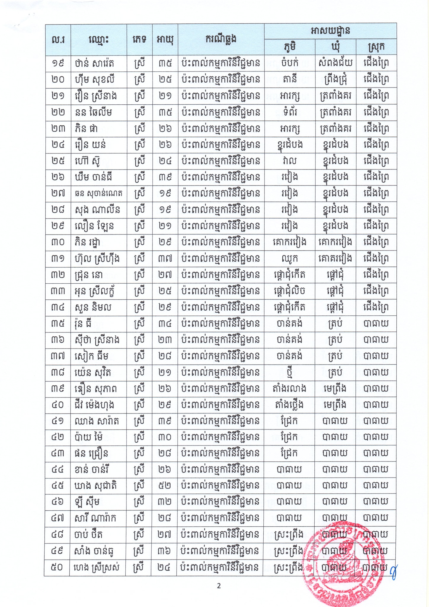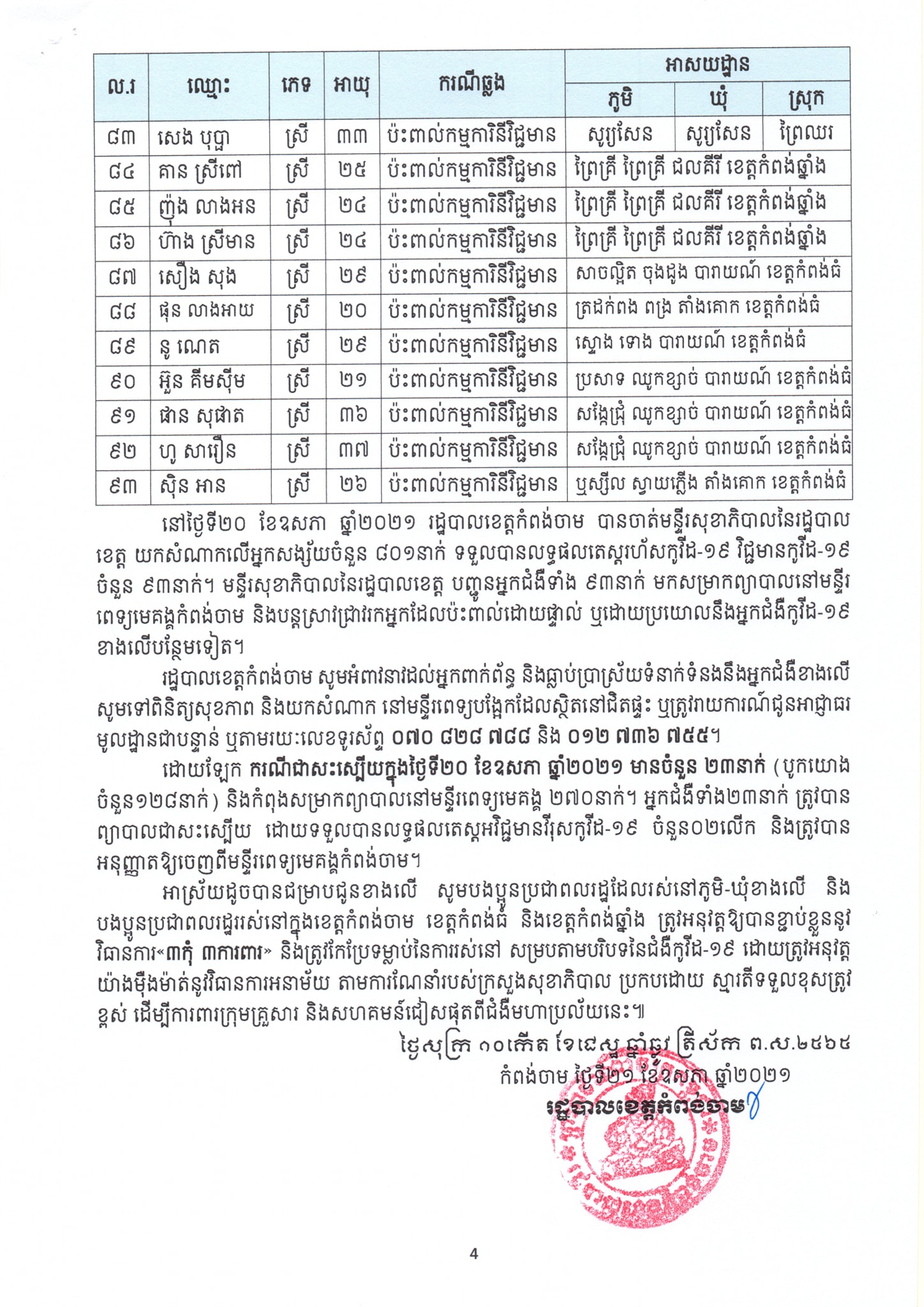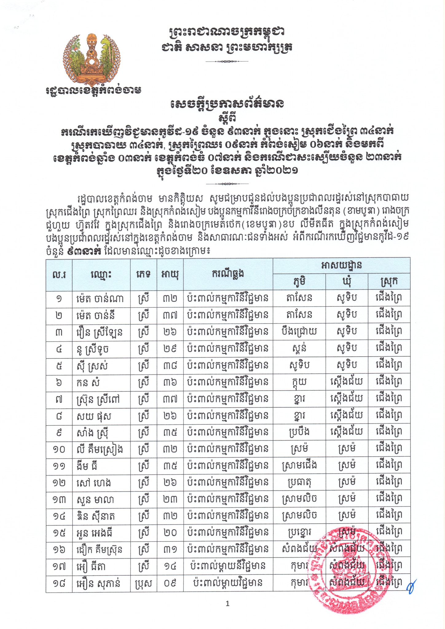 យោងតាមសេចក្តីប្រកាសព័ត៌មានរបស់រដ្ឋបាលខេត្តកំពង់ចាម បានជម្រាបជូនដល់បងប្អូនប្រជាពលរដ្ឋរស់នៅស្រុកបាធាយ ស្រុកជើងព្រៃ ស្រុកព្រៃឈរ និងស្រុកកំពង់សៀម បងប្អូនកម្មករ-កម្មការិនីរោងចក្រ ខាងលីនតុន (ខាមបូឌា) រោងចក្រ ជួហួយ ហ្វ៊ូតវវែ ក្នុងស្រុកជើងព្រៃ និងរោងចក្រមេតថេក (ខេមបូឌា) ខប លីមីតធីត ក្នុងស្រុកកំពង់សៀម បងប្អូនប្រជាពលរដ្ឋរស់នៅក្នុងខេត្តកំពង់ចាម និងសាធារណៈជនទាំងអស់ អំពីករណីរកឃើញវិជ្ជមានកូវីដ១៩ ចំនួន៩៣នាក់ ដែលមានឈ្មោះដូចខាងក្រោម៖