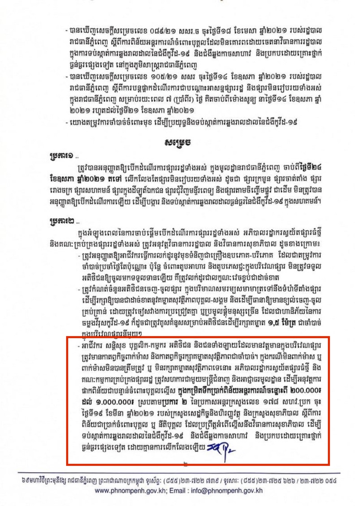 ក្នុងនោះផងដែរ អាជីវករ សន្តិសុខ បុគ្គលិក-កម្មករ អតិថិជន និងជនទាំងឡាយ ដែលមានវត្តមានក្នុងបរិវេណផ្សារត្រូវមានកាតព្វកិច្ចពាក់ម៉ាស និងកាតព្វកិច្ចរក្សាគម្លាតសុវត្ថិភាពជាចាំបាច់។ ក្នុងករណីមិនពាក់ម៉ាស ឬពាក់ម៉ាសមិនត្រឹមត្រូវ ឬមិនរក្សាគម្លាតសុវត្ថិភាពទេនោះ អភិបាលរដ្ឋាករស្វយ័តផ្សារធំថ្មី និងគណៈកម្មការគ្រប់គ្រងផ្សាររដ្ឋ ត្រូវសហការជាមួយមន្ត្រីជំនាញ និងអាជ្ញាធរមូលដ្ឋាន ដើម្បីអនុវត្តការផាកពិន័យជាបន្ទាន់ចំពោះបុគ្គលល្មើស ក្នុងកម្រិតទឹកប្រាក់ពិន័យអន្តរការណ៍ចន្លោះពី ២០០.០០០៛ ដល់ ១.០០០.០០០៛។