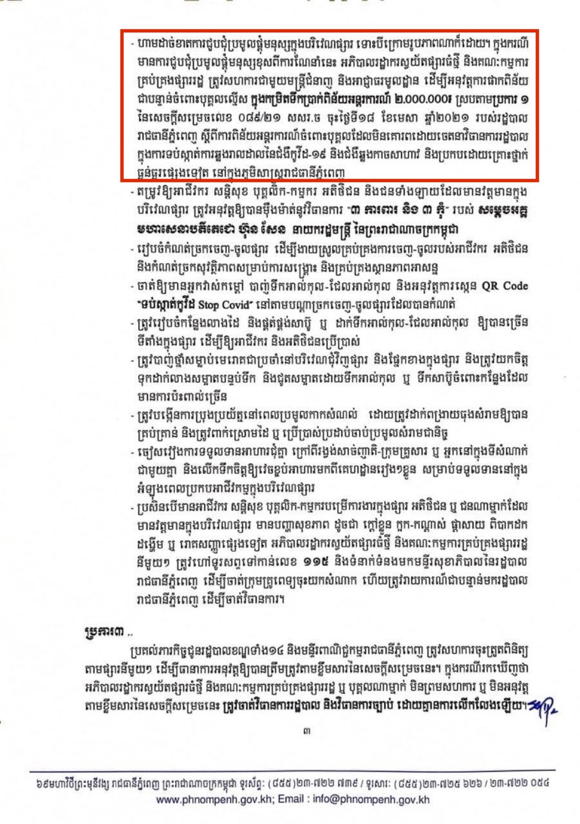 ហាមដាច់ខាតការជួបជុំប្រមូលផ្តុំមនុស្សក្នុងបរិវេណផ្សារ ទោះបីក្រោមរូបភាពណាក៏ដោយ ក្នុងករណីមានការជួបជុំប្រមូលផ្តុំមនុស្សខុសពីការណែនាំនេះ អភិបាលរដ្ឋាករស្វយ័តផ្សារធំថ្មី និងគណៈកម្មការគ្រប់គ្រងផ្សាររដ្ឋ ត្រូវសហការជាមួយមន្ត្រីជំនាញ និងអាជ្ញាធរមូលដ្ឋាន ដើម្បីអនុវត្តការផាកពិន័យជាបន្ទាន់ចំពោះបុគ្គលល្មើស ក្នុងកម្រិតទឹកប្រាក់ពិន័យអន្តរការណ៍ចន្លោះពី ២.០០០.០០០៛។