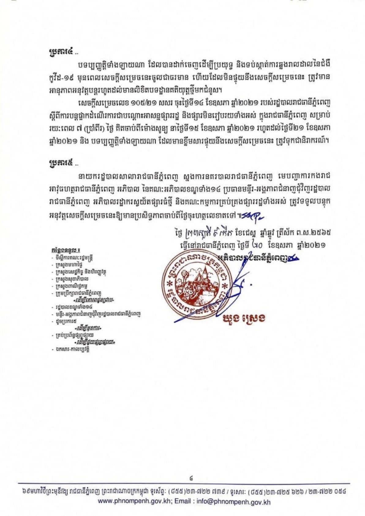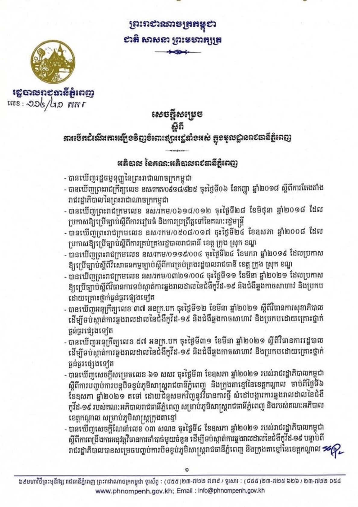 យោងតាមសេចក្តីសម្រេចរបស់រដ្ឋបាលរាជធានីភ្នំពេញ ចុះថ្ងៃទី២០ ខែឧសភា ឆ្នាំ២០២១ បានឲ្យដឹងថា រដ្ឋបាលរាជធានីភ្នំពេញ សម្រេចអនុញ្ញាតឲ្យបើកដំណើរការផ្សាររដ្ឋទាំងអស់ ក្នុងមូលដ្ឋានរាជធានីភ្នំពេញ ចាប់ពីថ្ងៃទី២៤ ខែឧសភា ឆ្នាំ២០២១ តទៅ លើកលែងតែផ្សារមិនរៀបរយទាំងអស់ ដូចជា ផ្សារក្រមួន ផ្សារចាត់តាំង ផ្សាររោងចក្រ ផ្សារសហគមន៍ ផ្សារក្នុងដីឡូត៍ឯកជន ផ្សារជុំវិញមន្ទីរពេទ្យ និងផ្សារតាមចិញ្ចើមផ្លូវ ជាដើម មិនត្រូវបានអនុញ្ញាតឲ្យបើកដំណើរការឡើយ ដើម្បីបង្ការ និងទប់ស្កាត់ការឆ្លងរាលដាលធ្ងន់ធ្ងរនៃជំងឺកូវីដ១៩ ក្នុងសហគមន៍។