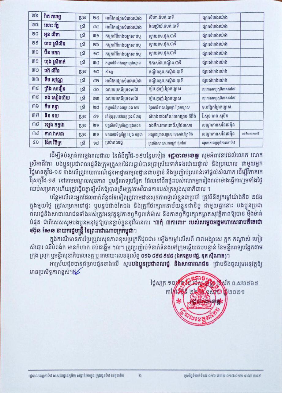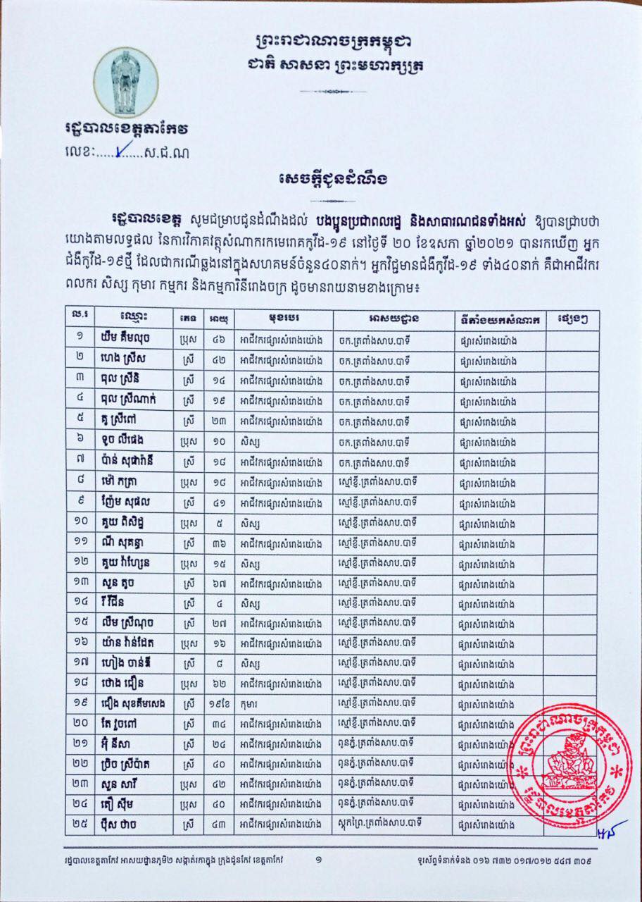 យោងតាមសេចក្តីជូនដំណឹង ដល់បងប្អូនប្រជាពលរដ្ឋ និងសាធារណជនទាំងអស់ ឲ្យបានជ្រាបថា យោងតាមលទ្ធផលនៃការវិភាគវត្ថុសំណាករកមេរោគកូវីដ១៩ នៅថ្ងៃទី២០ ខែឧសភា ឆ្នាំ២០២១ បានរកឃើញអ្នកជំងឺកូវីដ១៩ថ្មី ដែលជាករណីឆ្លងនៅក្នុងសហគមន៍ចំនួន៤០នាក់។ អ្នកវិជ្ជមានជំងឺកូវីដ១៩ ទាំង៤០នាក់នោះ គឺជាអាជីវករ ពលករ សិស្ស កុមារ កម្មករ និងកម្មការិនីរោងចក្រដូចមានរាយនាមខាងក្រោម៖