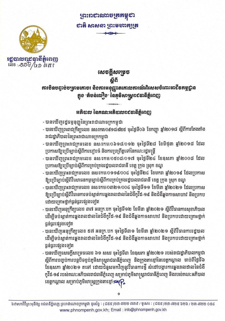 យោងតាមសេចក្តីជូនដំណឹងរបស់ រដ្ឋបាលរាជធានីភ្នំពេញ បានឲ្យដឹងថា រដ្ឋបាលរាជធានីភ្នំពេញ សម្រេចធ្វើការបិទបញ្ចប់បម្រាមគោចរ និងអនុញ្ញាតគោលការណ៍ពិសេសចំពោះអាជីវកម្មដ្ឋានមួយចំនួនក្នុង “តំបន់លឿង” នៃភូមិសាស្ត្ររាជធានីភ្នំពេញ គិតចាប់ពីម៉ោង ១២ យប់នេះ ថ្ងៃទី២២ ខែឧសភា ឆ្នាំ២០២១ តទៅ៖
