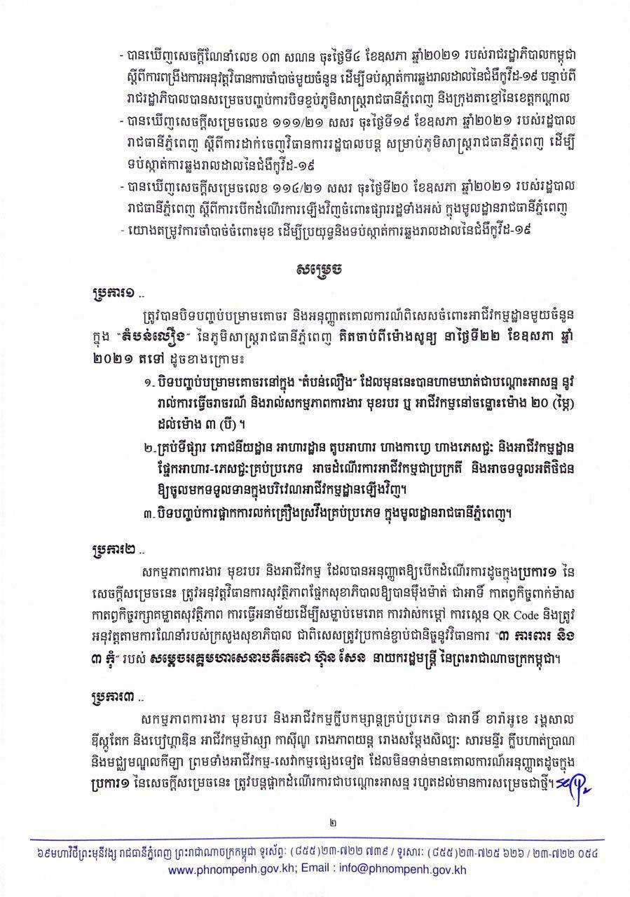 រដ្ឋបាលរាជធានីភ្នំពេញ អនុញ្ញាតឲ្យកន្លែងញ៉ាំអាហារអាចឲ្យភ្ញៀវចូលអង្គុយទទួលទានក្នុងហាងវិញបាន និងអនុញ្ញាតឲ្យមានការលក់ស្រវឹងវិញបាន