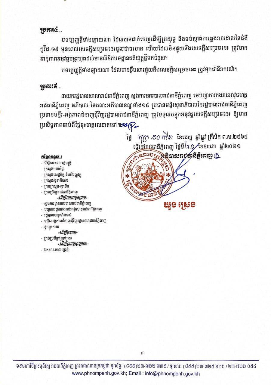 ៣- បិទបញ្ចប់ការផ្អាកការលក់គ្រឿងស្រវឹងគ្រប់ប្រភេទ ក្នុងមូលដ្ឋានរាជធានីភ្នំពេញ