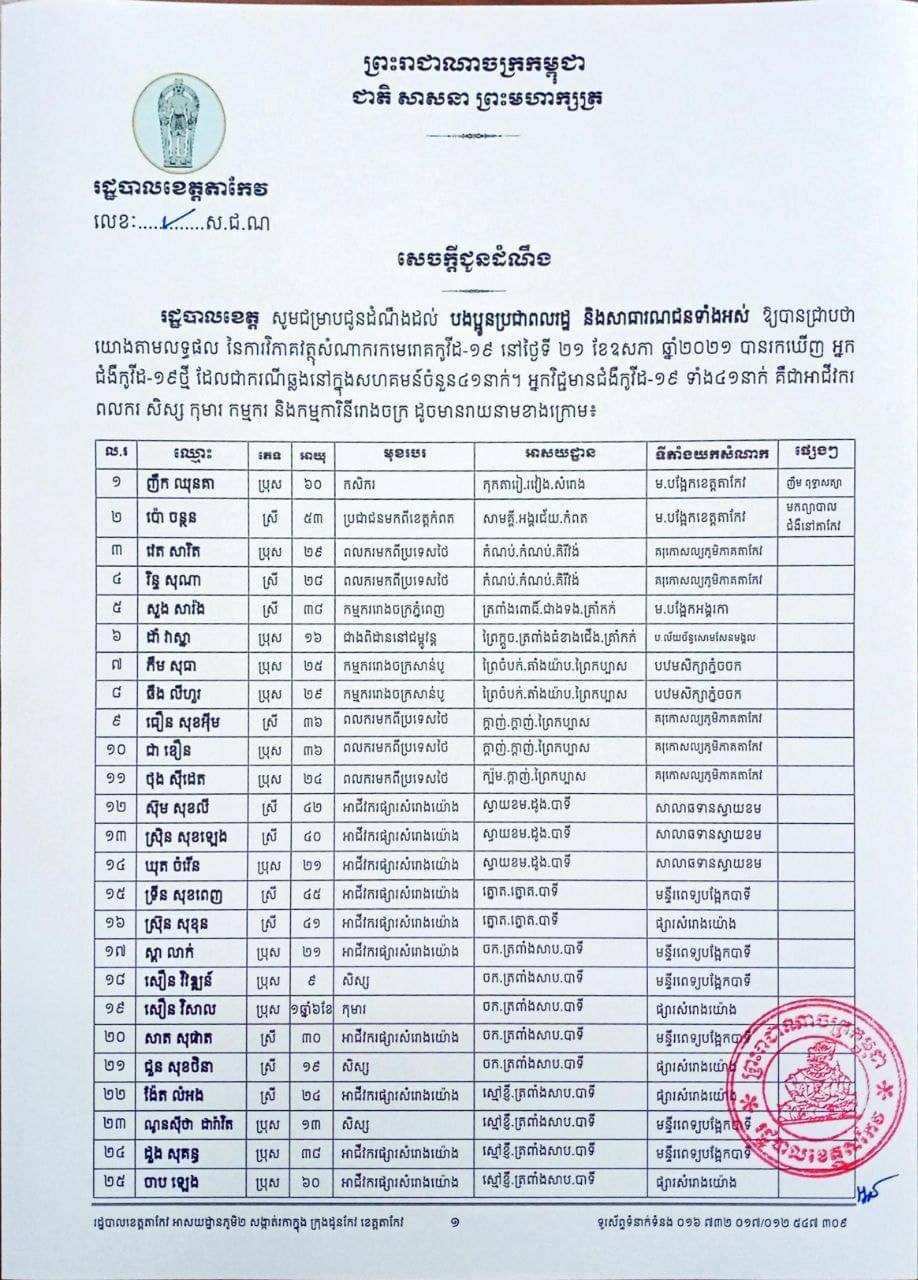 យោងតាមសេចក្តីជូនដំណឹង ដល់បងប្អូនប្រជាពលរដ្ឋ និងសាធារណជនទាំងអស់ ឲ្យបានជ្រាបថា យោងតាមលទ្ធផលនៃការវិភាគវត្ថុសំណាករកមេរោគកូវីដ១៩ នៅថ្ងៃទី២១ ខែឧសភា ឆ្នាំ២០២១ បានរកឃើញអ្នកជំងឺកូវីដ១៩ថ្មី ដែលជាករណីឆ្លងនៅក្នុងសហគមន៍ចំនួន៤១នាក់។ អ្នកវិជ្ជមានជំងឺកូវីដ១៩ ទាំង៤១នាក់នោះ គឺជាអាជីវករ ពលករ សិស្ស កុមារ កម្មករ និងកម្មការិនីរោងចក្រដូចមានរាយនាមខាងក្រោម៖