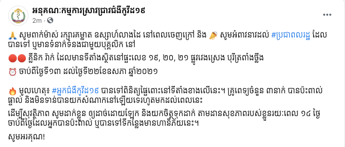 យោងតាមការបញ្ជាក់ពី អនុគណៈកម្មការស្រាវជ្រាវជំងឺកូវីដ១៩ បានឲ្យដឹងថា សូមពាក់ម៉ាស់ រក្សារគម្លាត ឧស្សាហ៍លាងដៃ នៅពេលចេញក្រៅ និងសូមអំពាវនាវដល់ប្រជាពលរដ្ឋ ដែល​បានទៅ ឬមានទំនាក់ទំនងជាមួយបុគ្គលិក នៅ គ្លីនិក រ៉ាក់ ដែលមានទីតាំងស្ថិតនៅផ្ទះលេខ ១៩, ២០, ២១ ផ្លូវវេងស្រេង បុរីត្រពាំងថ្លឹង ចាប់ពីថ្ងៃទី១៣ ដល់ថ្ងៃទី២២ខែឧសភា ឆ្នាំ២០២១ ដោយមូលហេតុ៖ អ្នកជំងឺកូវីដ១៩​​ បានទៅពិនិត្យផ្ទៃពោះនៅទីតាំងខាងលើនេះ។ គ្រូពេទ្យចំនួន ៣នាក់ បានប៉ះពាល់ផ្ទាល់​ និងមិនទាន់បានយកសំណាកនៅឡើយទេរហូតមកដល់ពេលនេះ។
