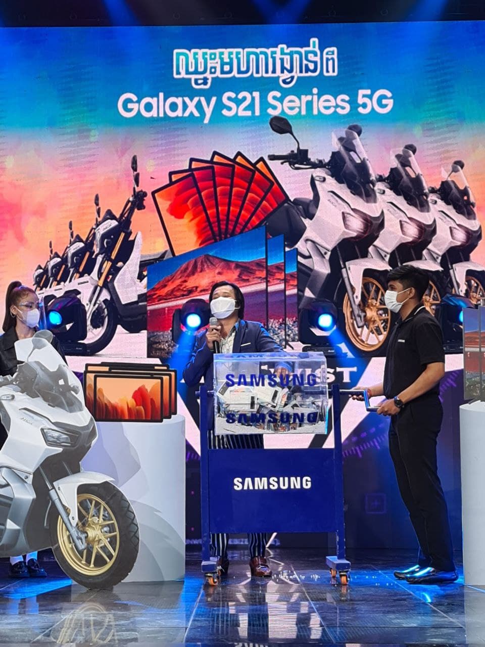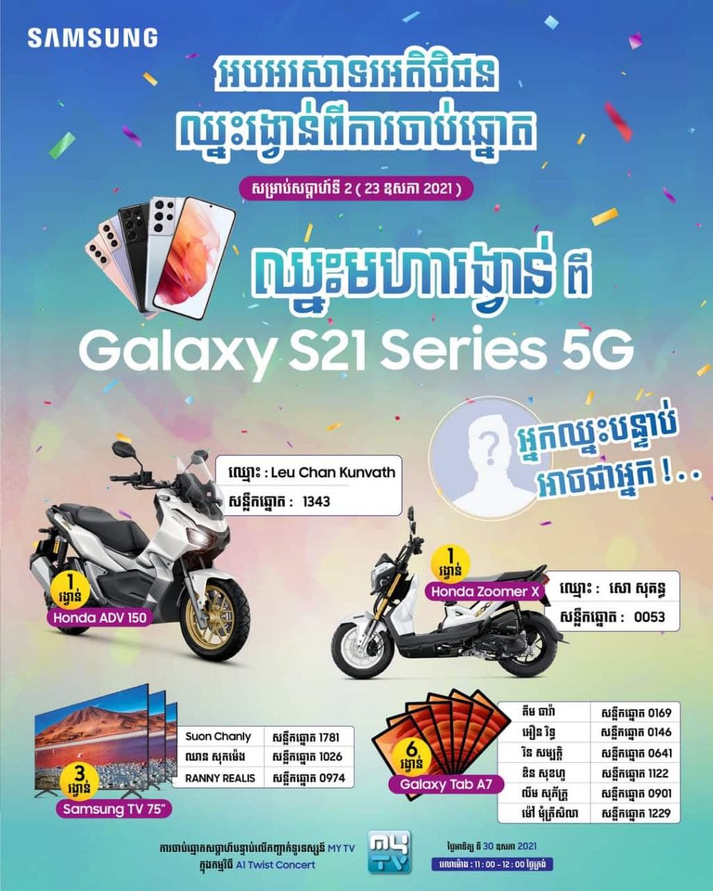 សូមរំឮកផងដែរថានេះជាកម្មវិធីចាប់ឆ្នោតផ្សងសំណាងអាទិត្យទី2 របស់កម្មវិធី “ឈ្នះមហារង្វាន់ពី Samsung Galaxy S21 5G” ក្នុងចំណោមឱកាសចំនួន 4 ដង រៀងរាល់ថ្ងៃអាទិត្យនៅស្ថានីយទូរទស្សន៍ MyTV ក្នុងកម្មវិធី A1 Twist វេលាម៉ោង 11:00-12:00 ថ្ងៃត្រង់! ហើយនេះជាសប្តាហ៍ទី2 នៃការចាប់រង្វាន់ ដ៏រំជួលចិត្តនេះ! យើងនៅសល់តែ 2 លើក ទៀតទេ……ដូច្នោះអតិថិជន ទាំងអស់នៅតែអាចមានឱកាសទទួលបានសំណាងឈ្នះមហារង្វាន់ពី សាមសុង ដែលមានដូចជា៖ម៉ូតូ Honda ADV ,ម៉ូតូ Honda Zoomer X,ទូរទស្សន៍ Samsung 75 អ៊ីញ និង Samsung ថេប្លេត A7។
