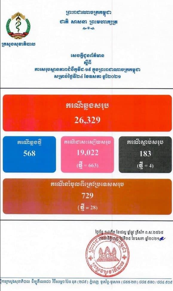 នៅថ្ងៃទី២៥ ខែឧសភា ឆ្នាំ២០២១នេះ ក្រសួងសុខាភិបាលកម្ពុជា បានចេញសេចក្តីជូនដំណឹងពី ការរកឃើញករណីវិជ្ជមានវីរុសកូវីដ១៩ថ្មី ៥៦៨ចំនួន នាក់ ខណៈអ្នកបានជាសះស្បើយថ្មីមានចំនួន ៦៦៣នាក់ និងមានអ្នកបាត់បង់ជីវិត០៤នាក់។ គិតមកទល់ពេលនេះ ករណីឆ្លងកូវីដ១៩ សរុបនៅក្នុងប្រទេសកម្ពុជា មានចំនួន ២៦,៣២៩នាក់, ករណីជាសះស្បើយសរុប ១៩,០២២នាក់ និងស្លាប់សរុប ១៨៣នាក់៕