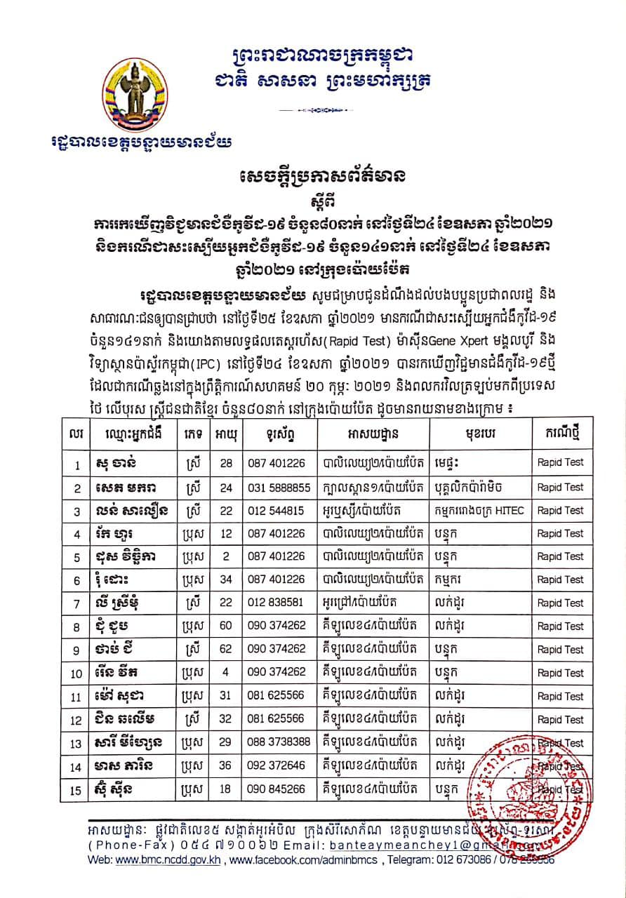 យោងតាមការបញ្ជាក់ពីរដ្ឋបាលខេត្តបន្ទាយមានជ័យ បានឲ្យដឹងថា នៅថ្ងៃទី២៥ ខែឧសភា ឆ្នាំ២០២១ មានករណីជាសះស្បើយអ្នកជំងឺកូវីដ១៩ ចំនួន១៤១នាក់ និងយោងតាមលទ្ធផលតេស្តរហ័ស (Rapid Test) ម៉ាស៊ីន Gene Xpert មង្គលបូរី និងវិទ្យាស្ថានប៉ាស្ទ័រកម្ពុជា (IPC) នៅថ្ងៃទី២៤ ខែឧសភា ឆ្នាំ២០២១ បានរកឃើញវិជ្ជមានជំងឺកូវីដ១៩ថ្មី ដែលជាករណីឆ្លងនៅក្នុងព្រឹត្តិការណ៍សហគមន៍ ២០កុម្ភៈ ២០២១ និងពលករវិលត្រឡប់មកពីប្រទេសថៃ លើបុរសជនជាតិខ្មែរ ចំនួន៨០នាក់ នៅក្រុងប៉ោយប៉ែត ដូចមានរាយនាមខាងក្រោម៖