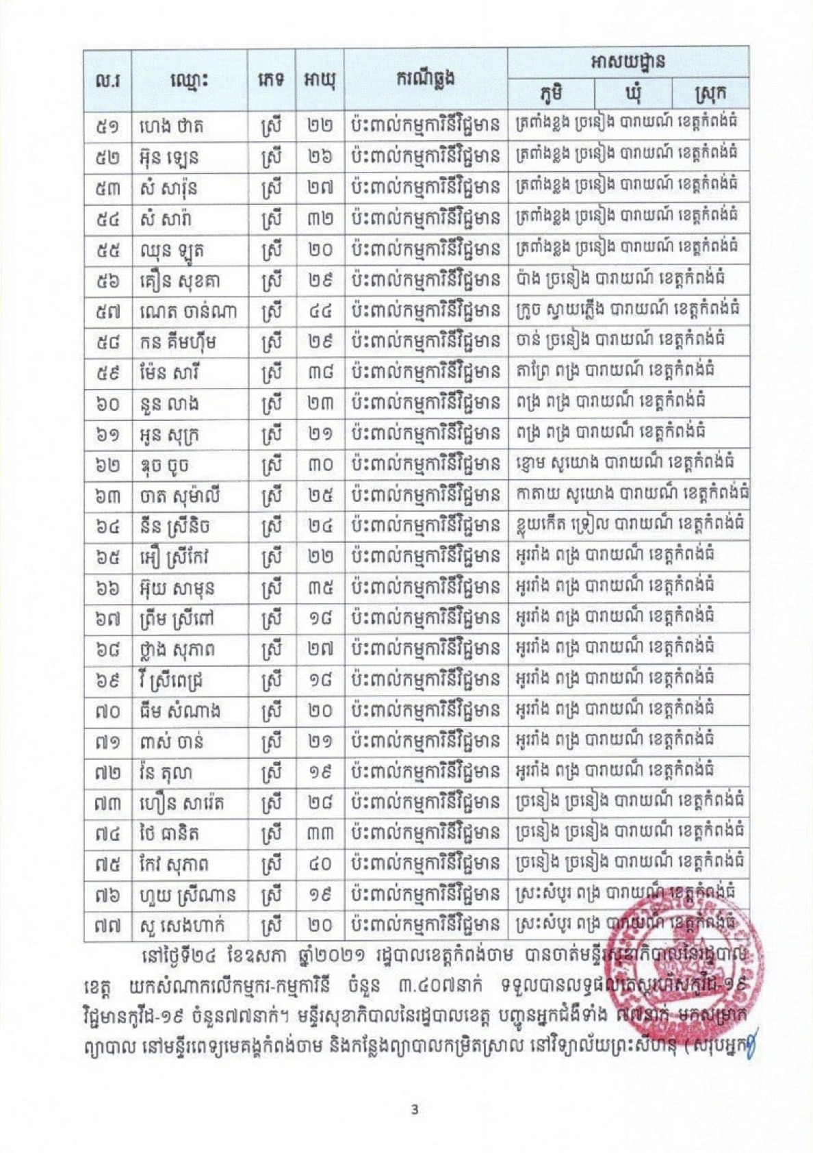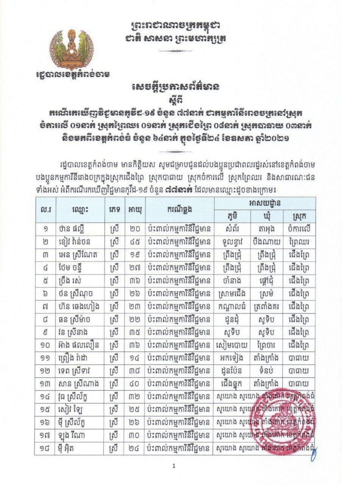 យោងតាមការបញ្ជាក់ពី រដ្ឋបាលខេត្តកំពង់ចាម បានចេញសេចក្តីប្រកាសព័ត៌មាន ជម្រាបជូនដល់បងប្អូនប្រជាពលរដ្ឋរស់នៅខេត្តកំពង់ចាម បងប្អូនកម្មការិនីរោងចក្រក្នុងស្រុកជើងព្រៃ ស្រុកបាធាយ ស្រុកចំការលើ ស្រុកព្រៃឈរ និងសាធារណៈជនទាំងអស់ អំពីករណីរកឃើញវិជ្ជមានកូវីដ១៩ ចំនួន ៧៧នាក់ ដែលមានឈ្មោះដូចខាងក្រោម៖