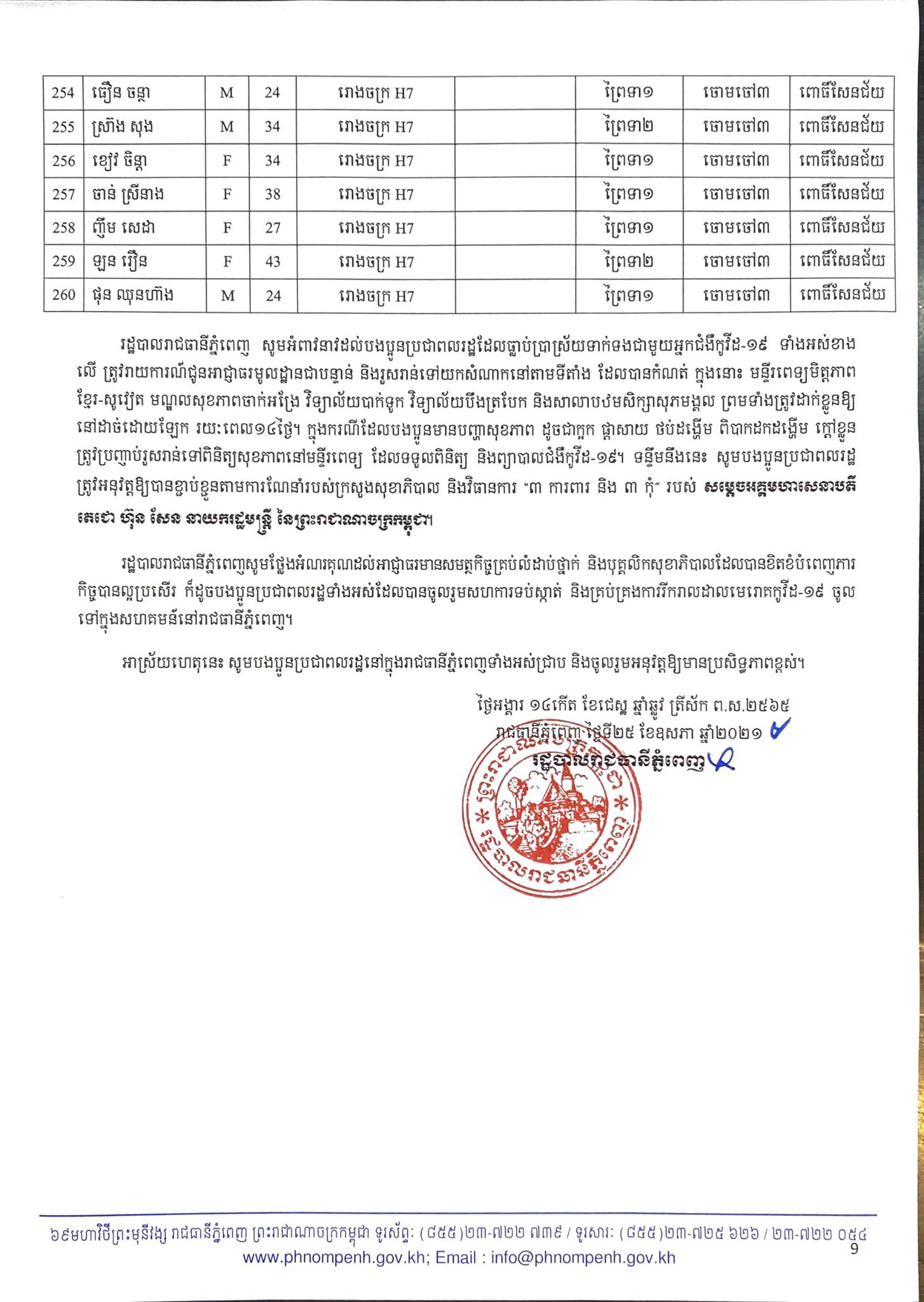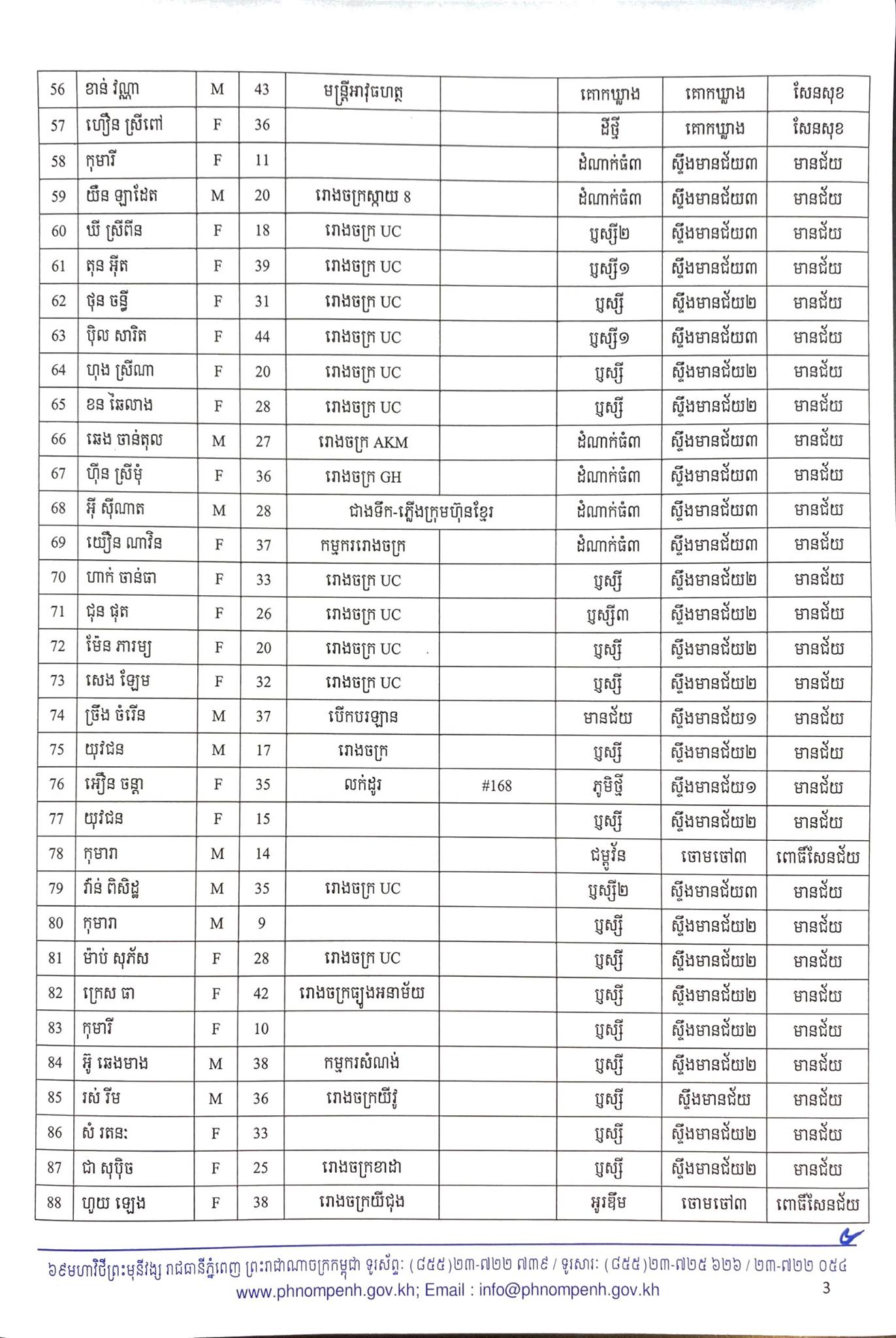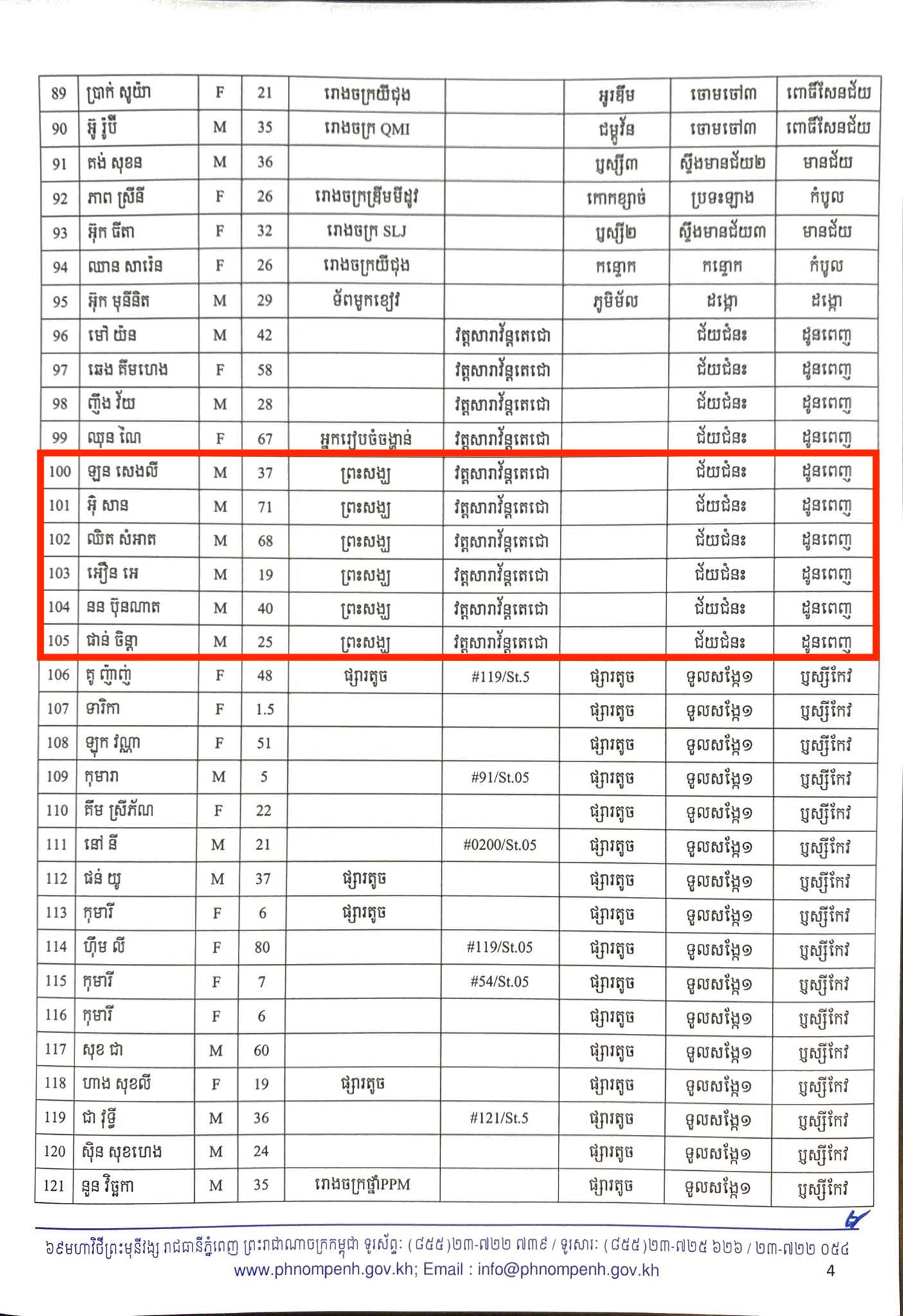 មុននេះបន្តិច រដ្ឋបាលរាជធានីភ្នំពេញ បានធ្វើការបង្ហាញអត្តសញ្ញាណអ្នកឆ្លងកូវីដ១៩ថ្មី ចំនួន២៦០នាក់នៅក្នុងរាជធានីភ្នំពេញ ហើយក្នុងចំណោមនោះមានព្រះសង្ឃនៅវត្តសារាវ័ន្តតេជោចំនួន៦អង្គផងដែរបានឆ្លងកូវីដ ដែលមានដូចខាងក្រោម៖