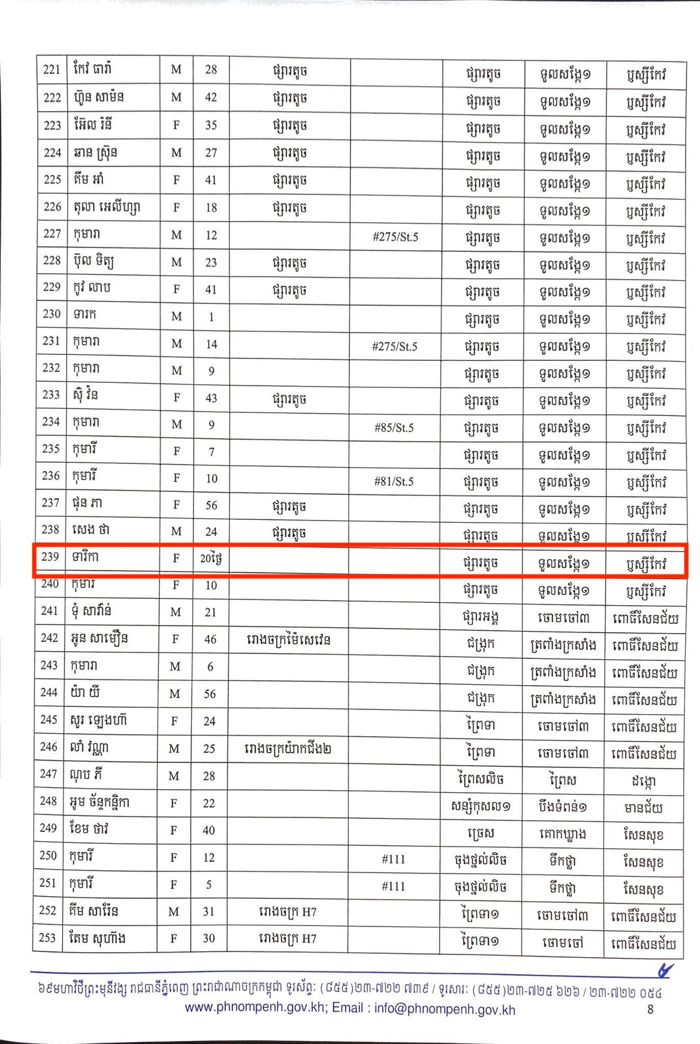 មុននេះបន្តិច រដ្ឋបាលរាជធានីភ្នំពេញ បានធ្វើការបង្ហាញអត្តសញ្ញាណអ្នកឆ្លងកូវីដ១៩ថ្មី ចំនួន២៦០នាក់នៅក្នុងរាជធានីភ្នំពេញ ហើយក្នុងចំណោមអ្នកទាំង២៦០នាក់នោះ មានទារិកាម្នាក់ ទើបកើតបាន២០ថ្ងៃ មានអាសយដ្ឋាននៅភូមិផ្សារតូច សង្កាត់ទួលសង្កែ១ ខណ្ឌឬស្សីកែវ បានឆ្លងជំងឺកូវីដ១៩