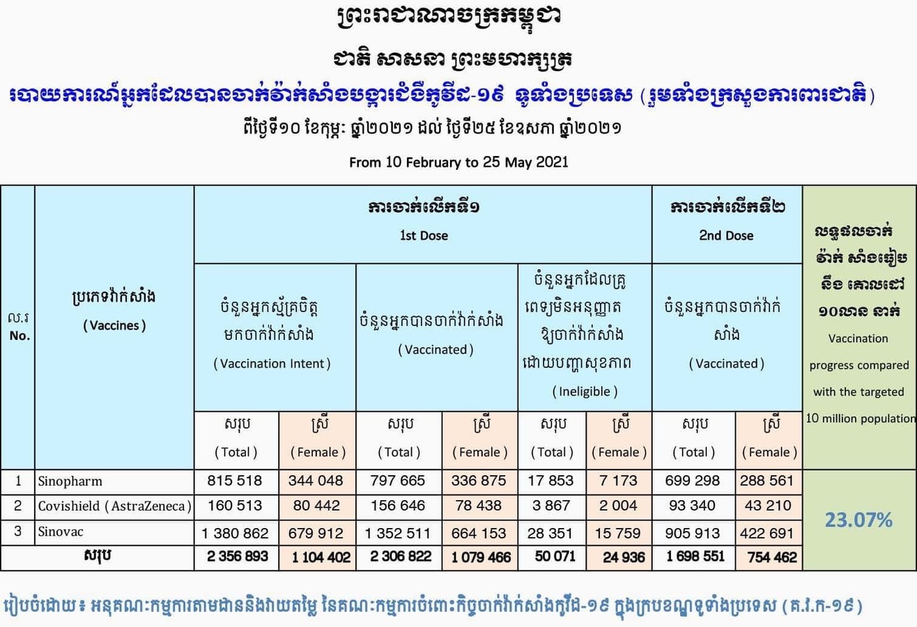 បើយោងតាមរបបាយការណ៍អ្នកដែលបានចាក់វ៉ាក់សាំងបង្ការជំងឹកូវីដ១៩ ទូទាំងប្រទេស (រួមទាំងក្រសួងការពារជាតិ) គិតចាប់ពីថ្ងៃទី១០ ខែកុម្ភៈ ឆ្នាំ២០២១ ដល់ថ្ងៃទី២៥ ខែឧសភា ឆ្នាំ២០២១ បានឲ្យដឹងថា ចំនួនអ្នកបានចាក់វ៉ាក់សាំងលើកទី១ មានចំនួន ២,៣០៦,៨២២នាក់ (ក្នុងនោះមានស្រី ១,០៧៩,៤៦៦នាក់) ហើយអ្នកដែលគ្រូពេទ្យមិនអនុញ្ញាតឲ្យចាក់វ៉ាក់សាំងដោយសារតែបញ្ហាសុខភាពមានចំនួន ៥០,០៧១នាក់ (ក្នុងនោះមានស្រី ២៤,៩៣៦នាក់) ចំណែកឯអ្នកដែលបានចាក់វ៉ាក់សាំងលើកទី២ហើយមានចំនួន ១,៦៩៨,៥៥១នាក់ (ក្នុងនោះមានស្រី ៧៥៤,៤៦២នាក់)៕