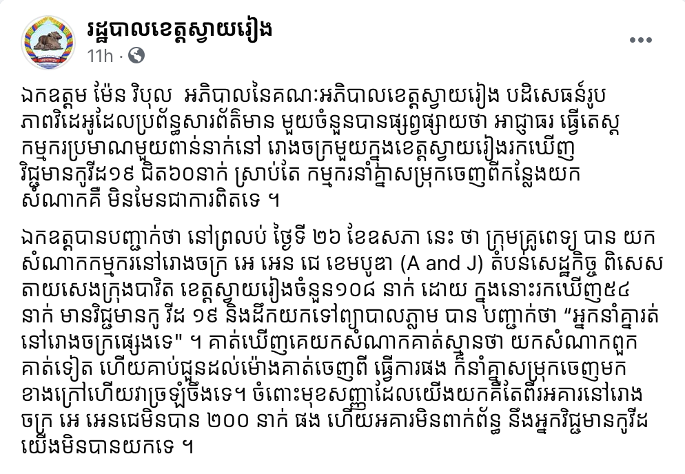 យោងតាមការបញ្ជាក់នៅលើទំព័រហ្វេសប៊ុក រដ្ឋបាលខេត្តស្វាយរៀង បានឲ្យដឹងថា ឯកឧត្តម ម៉ែន វិបុល អភិបាលនៃគណៈអភិបាលខេត្តស្វាយរៀង​ បដិសេធ​រូបភាពវិដេអូដែលប្រព័ន្ធសារព័ត៌មានមួយចំនួនបានផ្សព្វផ្សាយថា អាជ្ញាធរធ្វើតេស្ដកម្មករប្រមាណមួយពាន់នាក់នៅ រោងចក្រមួយក្នុងខេត្តស្វាយរៀងរកឃើញ វិជ្ជមានកូវីដ១៩ ជិត៦០នាក់ ស្រាប់តែកម្មករនាំគ្នាសម្រុកចេញពីកន្លែងយកសំណាកគឺ មិនមែនជាការពិតទេ ។