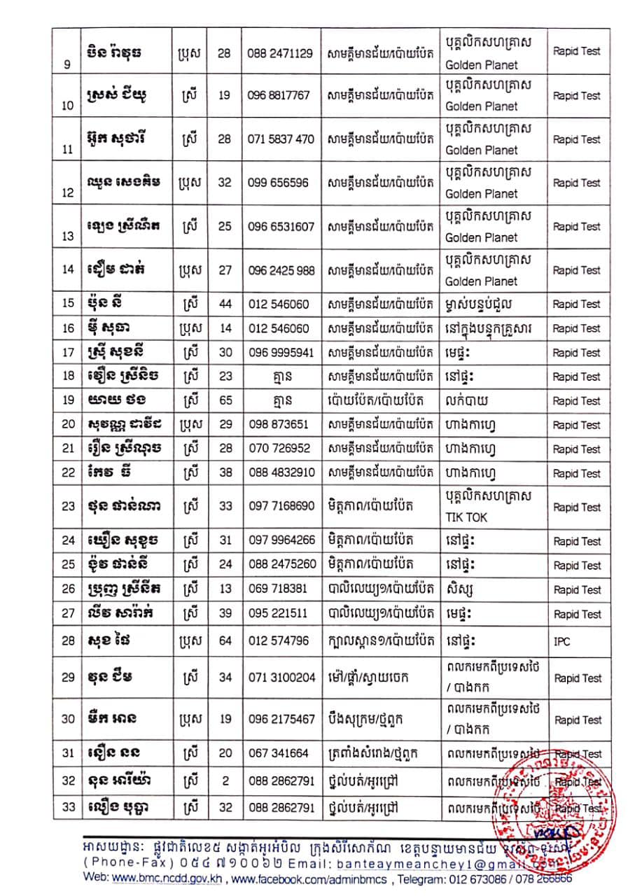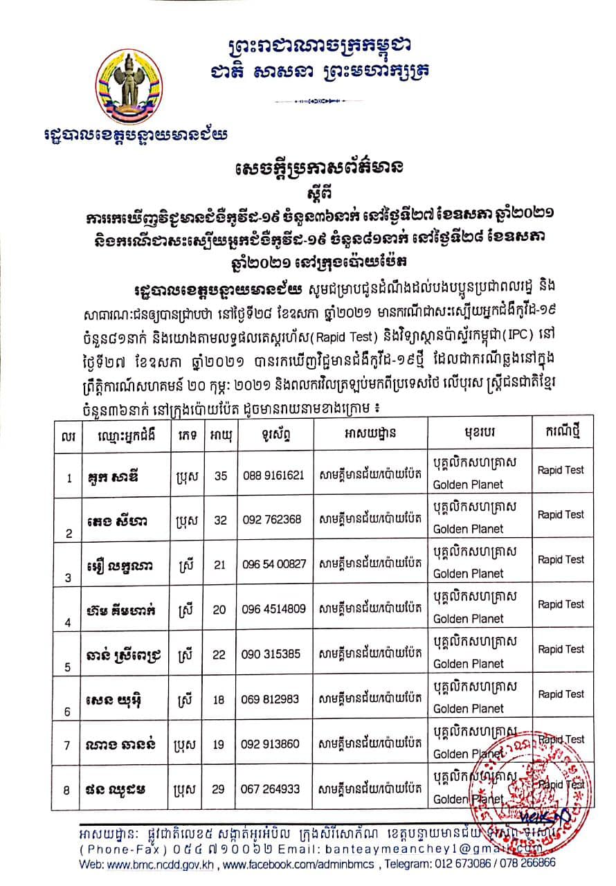ខេត្តបន្ទាយមានជ័យ៖ យោងតាមការចុះផ្សាយរបស់ រដ្ឋបាលខេត្តបន្ទាយមានជ័យ បានបង្ហាញអត្តសញ្ញាណ និងរកឃើញអ្នកវិជ្ជមានកូវីដ១៩ថ្មីចំនួន ៣៦នាក់ ដោយរដ្ឋបាលខេត្ត សូមជម្រាបជូនដំណឹងដល់បងប្អូនប្រជាពលរដ្ឋ និងសាធារណជន ឲ្យបានជ្រាបថា នៅថ្ងៃទី២៨ ខែឧសភា ឆ្នាំ២០២១ មានករណីជាសះស្បើយអ្នកជំងឺកូវីដ-១៩ ចំនួន៨១នាក់ និងយោងតាមលទ្ធផលតេស្តរហ័ស (Rapid Test) និងវិទ្យាស្ថានប៉ាស្ទ័រកម្ពុជា (IPC) នៅថ្ងៃទី២៧ ខែឧសភា ឆ្នាំ២០២១ បានរកឃើញវិជ្ជមានជំងឺកូវីដ-១៩ថ្មី ដែលជាករណីឆ្លងនៅក្នុងព្រឹត្តិការណ៍សហគមន៍ ២០ កុម្ភៈ ២០២១ និងពលករវិលត្រឡប់មកពីប្រទេសថៃ លើបុរស ស្ត្រីជនជាតិខ្មែរ ចំនួន ៣៦នាក់ នៅក្រុងប៉ោយប៉ែត ដូចរាយនាមខាងក្រោម៖
