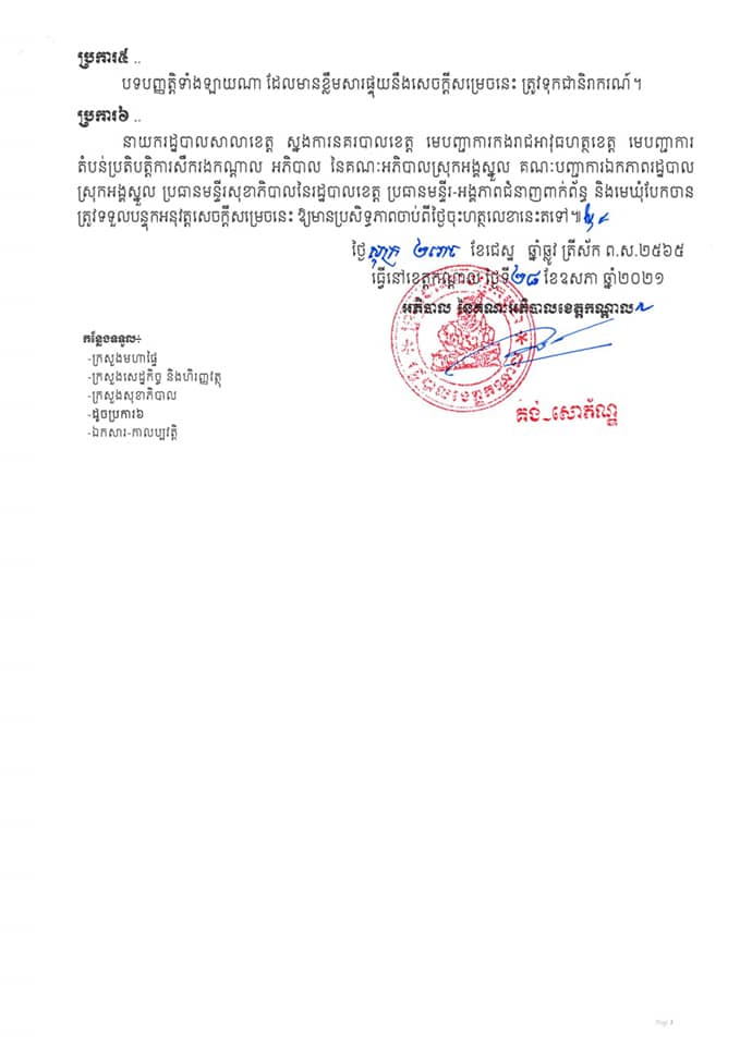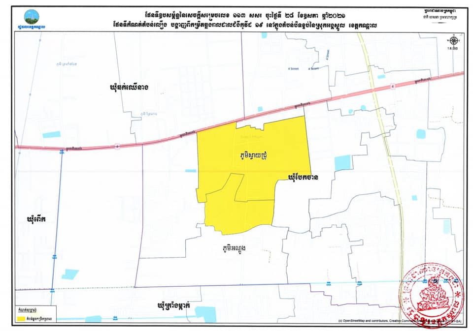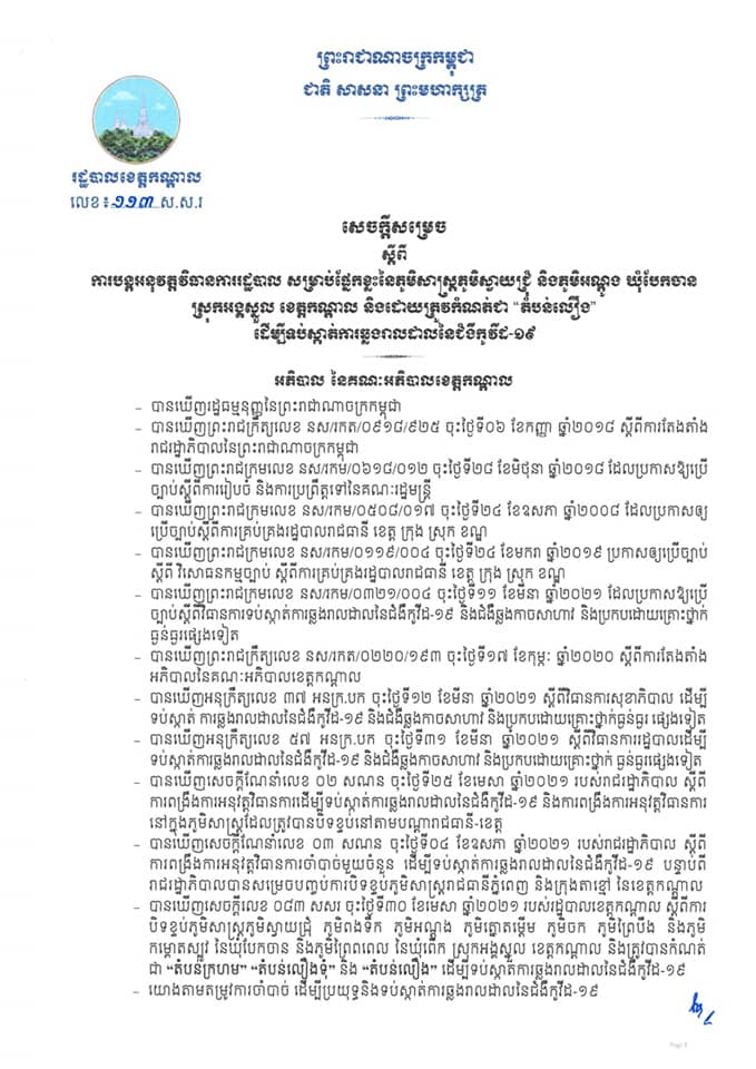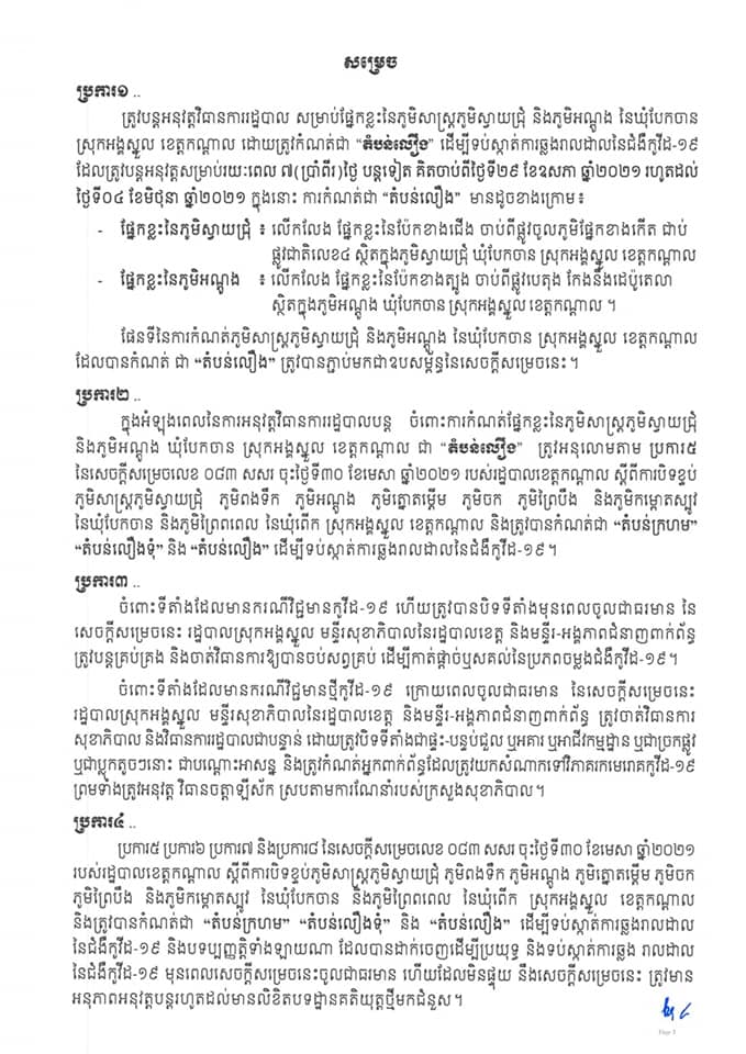 រដ្ឋបាលខេត្តកណ្ដាល នាថ្ងៃទី២៨ ខែឧសភា ឆ្នាំ២០២១នេះ បានចេញសេចក្តីសម្រេច ស្តីពីការ បន្តអនុវត្តវិធានការរដ្ឋបាល សម្រាប់ផ្នែកខ្លះនៃភូមិសាស្ត្រភូមិស្វាយជ្រុំ និងភូមិអណ្ដូង នៃឃុំបែកចាន ស្រុកអង្គស្នួល ខេត្តកណ្ដាល និងដោយត្រូវកំណត់ជា “តំបន់លឿង” ដើម្បីទប់ស្កាត់ការឆ្លងរាលដាលនៃជំងឺកូវីដ-១៩។ សូមអានខ្លឹមាសារទាំងស្រុងដូចខាងក្រោម៖