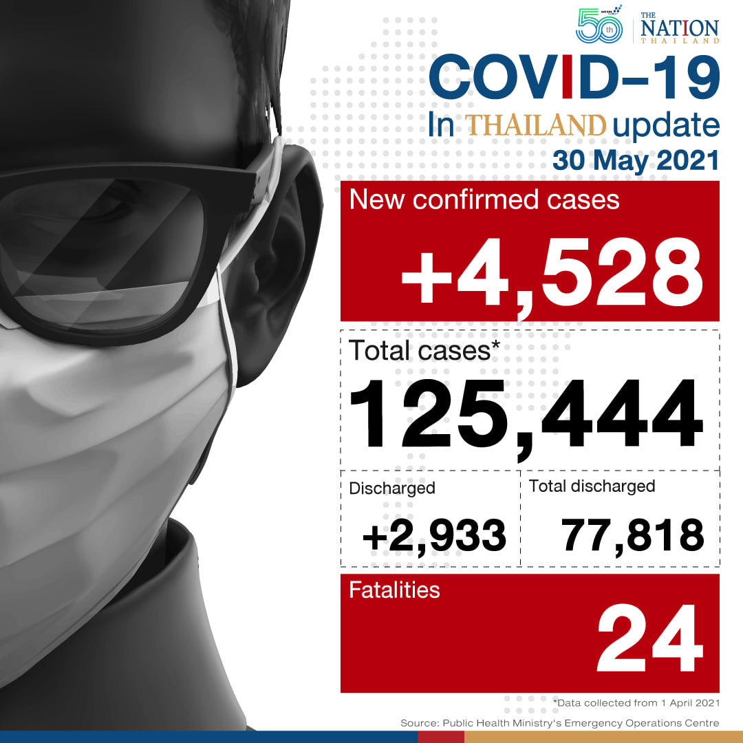 ថៃ៖ យោងតាមការចុះផ្សាយនៅក្នុងសារព័ត៌មាន The Nation Thailand បានឲ្យដឹងថា នៅក្នុងថ្ងៃអាទិត្យ ទី៣០ ខែ ឧសភានេះ អាជ្ញាធរសុខាភិបាលនៃប្រទេសថៃបានរកឃើញអ្នកឆ្លងជំងឺកូវីដ ១៩ ថ្មីចំនួន ៤,៥២៨នាក់ រីឯអ្នកស្លាប់ដោយសារជំងឺកូវីដ ១៩ វិញគឺមានចំនួន ២៤ នាក់។