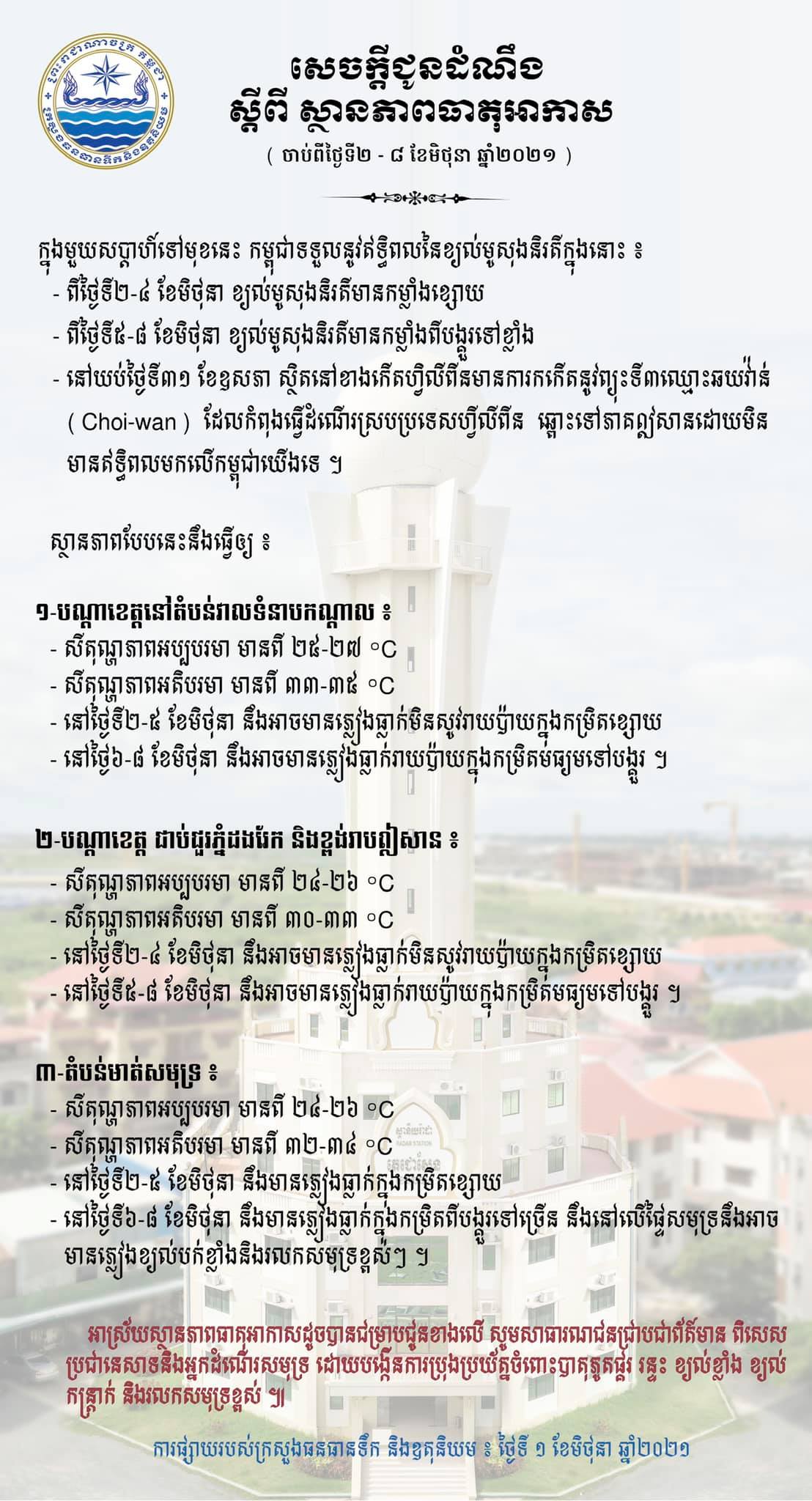 យោងតាមការបញ្ជាក់ពីក្រសួងធនធានទឹក និងឧតុនិយម ចាប់ពីថ្ងៃទី២ ខែមិថុនា ដល់ថ្ងៃទី៨ ខែមិថុនា បានឲ្យដឹងថា ក្នុងមួយសប្តាហ៍ទៅមុខនេះ កម្ពុជាទទួលឥទ្ធិពលនៃខ្យល់មូសុងនិរតីក្នុងនោះ៖