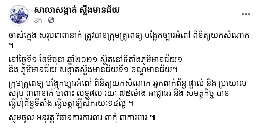 ក្រុមគ្រូពេទ្យ បង្អែកច្បារអំពៅ ពិនិត្យយកសំណាក អ្នកពាក់ព័ន្ធ ផ្ទាល់ និងប្រយោល សរុប ៣៣នាក់ ចំពោះលទ្ធផលរយៈ៧៥ម៉ោង អាជ្ញាធរ និងសមត្ថកិច្ចបានធ្វើហុំព័ន្ធទីតាំងធ្វើចត្តាឡីស័ករយៈ១៤ថ្ងៃ ។ សូមចូល អនុវត្ត វិធានការការពារ ៣កុំ ៣ការពារ ៕