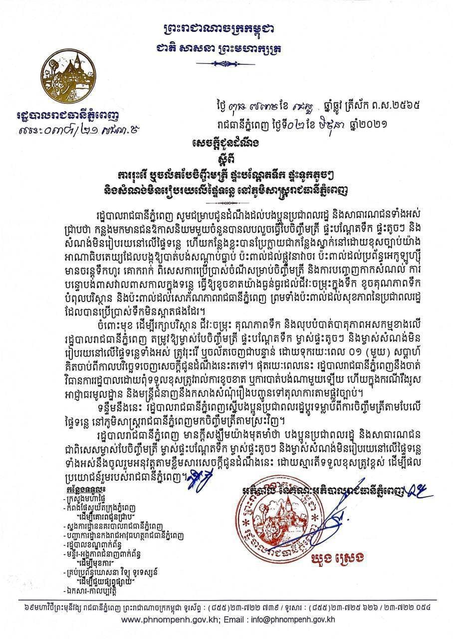 សូមអានសេចក្ដីជូនដំណឹងលម្អិតរបស់ រដ្ឋបាលរាជធានីភ្នំពេញ ដូចខាងក្រោ៖