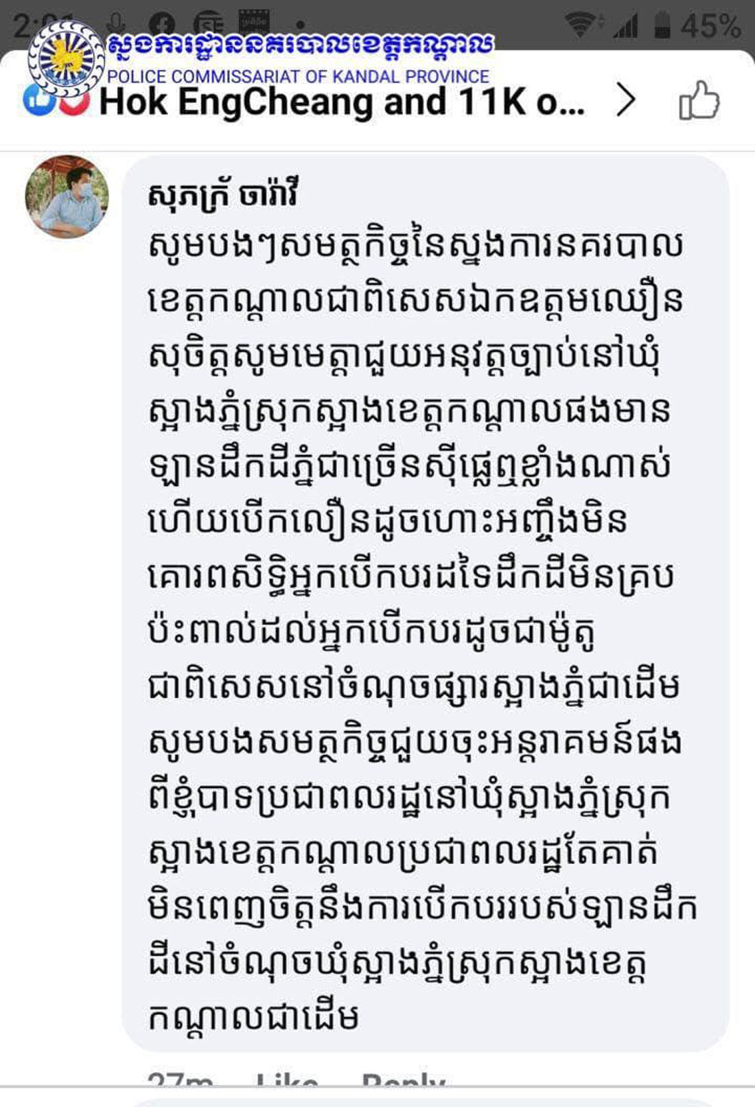 កណ្តាល ៖ ក្រុមការងារព័ត៌មាន និងប្រតិកម្មរហ័ស នៃស្នងការដ្ឋាននគរបាលខេត្តកណ្តាល មានកិត្តិយសសូមធ្វើការឆ្លើយតបជូនសាធារណជន និងគណនីហ្វេសប៊ុកឈ្មោះ សុភ័ក្រ ចារ៉ាវី ដែលបានបញ្ចេញមតិយោបល់ (comment) ចូលក្នុងផេកហ្វេសប៊ុករបស់ សម្ដេចតេជោ នាយករដ្ឋមន្ត្រី នៃព្រះរាជាណាចក្រកម្ពុជា ដែលមានខ្លឹមសារថា ៖ សូមបងៗសមត្ថកិច្ចនៃស្នងការនគរបាលខេត្តកណ្ដាល ជាពិសេស ឯកឧត្តម ឈឿន សុចិត្ត សូមមេត្តាជួយអនុវត្តច្បាប់នៅឃុំស្អាងភ្នំ ស្រុកស្អាង ខេត្តកណ្ដាលផង មានឡានដឹកដីភ្នំជាច្រើនស៊ីផ្លេឮខ្លាំងណាស់ហើយបើកលឿនដូចហោះអញ្ចឹងមិនគោរពសិទ្ធិអ្នកបើកបរដទៃ ដឹកដីមិនគ្របប៉ះពាល់ដល់អ្នកបើកបរដូចជាម៉ូតូ ជាពិសេសនៅចំណុចផ្សារស្អាងភ្នំជាដើម សូមបងសមត្ថកិច្ចជួយចុះអន្តរាគមន៍ផងពីខ្ញុំបាទប្រជាពលរដ្ឋនៅឃុំស្អាងភ្នំ ស្រុកស្អាង ខេត្តកណ្ដាល ប្រជាពលរដ្ឋគាត់មិនពេញចិត្តនឹងការបើកបររបស់ឡានដឹកដីនៅចំណុចឃុំស្អាងភ្នំ ស្រុកស្អាង ខេត្តកណ្ដាល ជាដើម ។