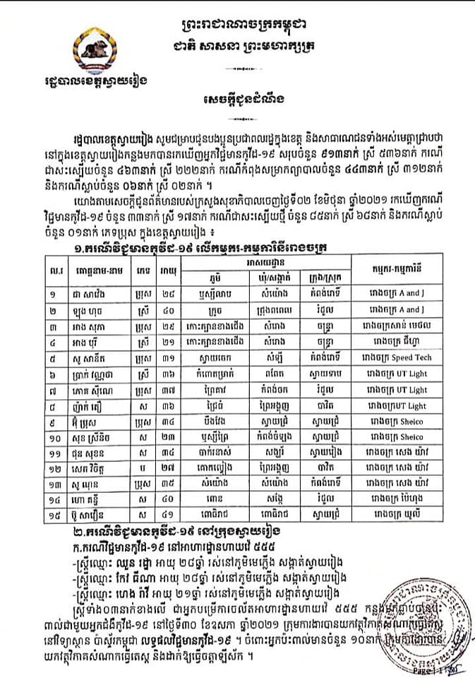 យោងតាមការបញ្ជាក់ពីរដ្ឋបាលខេត្តស្វាយរៀងបានឲ្យដឹងថា យោងតាមសេចក្តីជូនព័ត៌មានរបស់ក្រសួងសុខាភិបាលចេញថ្ងៃទី០២ ខែមិថុនា ឆ្នាំ២០២១ រកឃើញករណីវិជ្ជមានកូវីដ១៩ ចំនួន៣៣នាក់ ស្រី១៧នាក់ ករណីជាសះស្បើយថ្មី ចំនួន ៨៥នាក់ ស្រី៦៨នាក់ និងករណីស្លាប់ចំនួន ០១នាក់ ភេទ ប្រុស។
