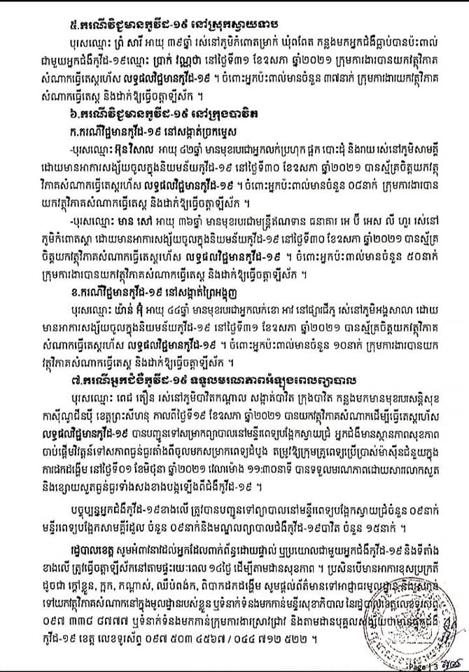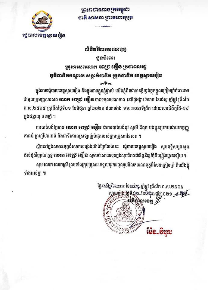 ករណីស្លាប់នោះមានឈ្មោះ លោក ពេជ្រ ភឿន បានទទួលមរណភាពនៅថ្ងៃអង្គារ ទី០១ ខែមិថុនា ឆ្នាំ២០២១ វេលាម៉ោង១១ និង៣០នាទីព្រឹក ដោយសារជំងឺកូវីដក្នុងជន្មាយុ ៤២ឆ្នាំ៕