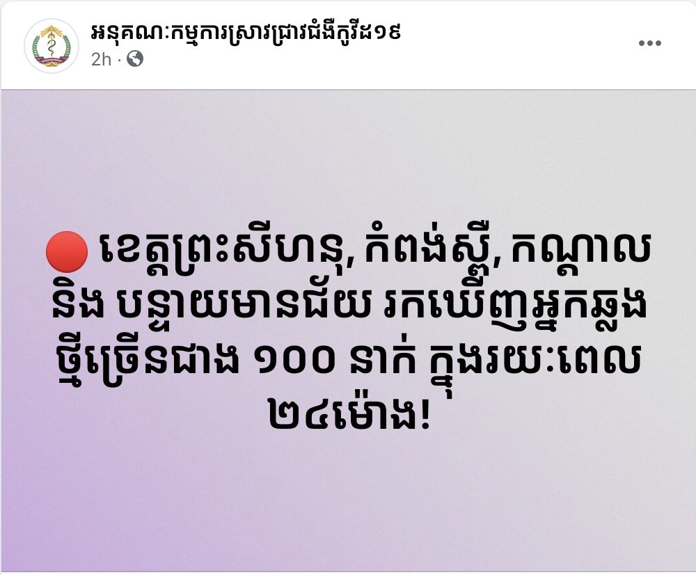 យោងតាមការបញ្ជាក់ពី អនុគណៈកម្មការស្រាវជ្រាវជំងឺកូវីដ១៩ បានឲ្យដឹងនាថ្ងៃទី៣ ខែមិថុនា ឆ្នាំ២០២១នេះថា ខេត្តព្រះសីហនុ, កំពង់ស្ពឺ, កណ្ដាល និង បន្ទាយមានជ័យ រកឃើញអ្នកឆ្លងថ្មីច្រើនជាង ១០០ នាក់ ក្នុងរយៈពេល ២៤ម៉ោង។ ដូច្នេះសូមបងប្អូនប្រជាពលរដ្ឋទាំងអស់ បន្តអនុវត្តតាមវិធានការ ៣ការពារ និង៣កុំ ដើម្បីការពារការរីករាលដាលកូវីដ១៩ និងដើម្បីកាត់ផ្តាច់ចរន្តនៃការចម្លងក្នុងសហគមន៍។