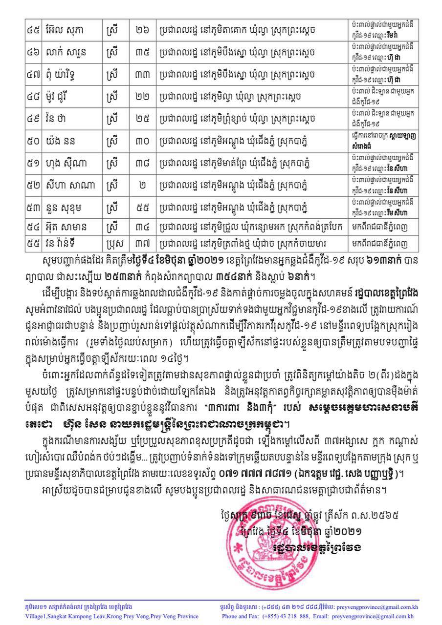 ខេត្តព្រៃវែង រកឃើញអ្នកកើតកូវីដ១៩ ចំនួន៥៥នាក់បន្ថែមទៀត, អ្នកឆ្លងសរុបកើនដល់ ៦១៣នាក់