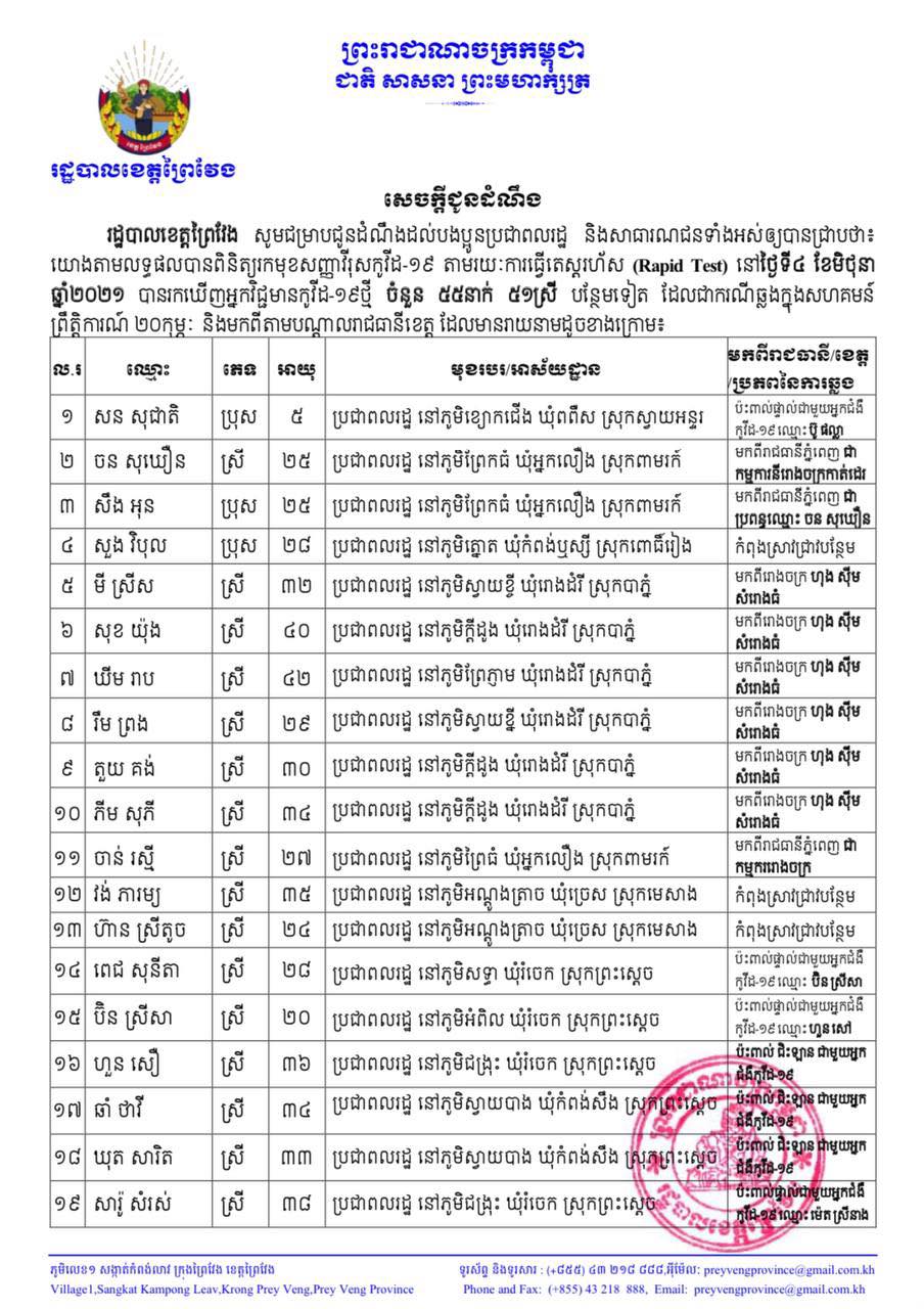 យោងតាមការបញ្ជាក់ពី រដ្ឋបាលខេត្តព្រៃវែង បានឲ្យដឹងថា នៅថ្ងៃទី៤ ខែមិថុនា ឆ្នាំ២០២១ រដ្ឋបាលខេត្ត បានរកឃើញ ករណីអ្នកវិជ្ជមានកូវីដ-១៩ ចំនួន៥៥នាក់បន្ថែមទៀត តាមរយៈការធ្វើតេស្តរហ័ស (Rapid Test) នៅមូលដ្ឋានក្នុងក្រុង/ស្រុកចំនួន១០ដូចខាងក្រោម:
