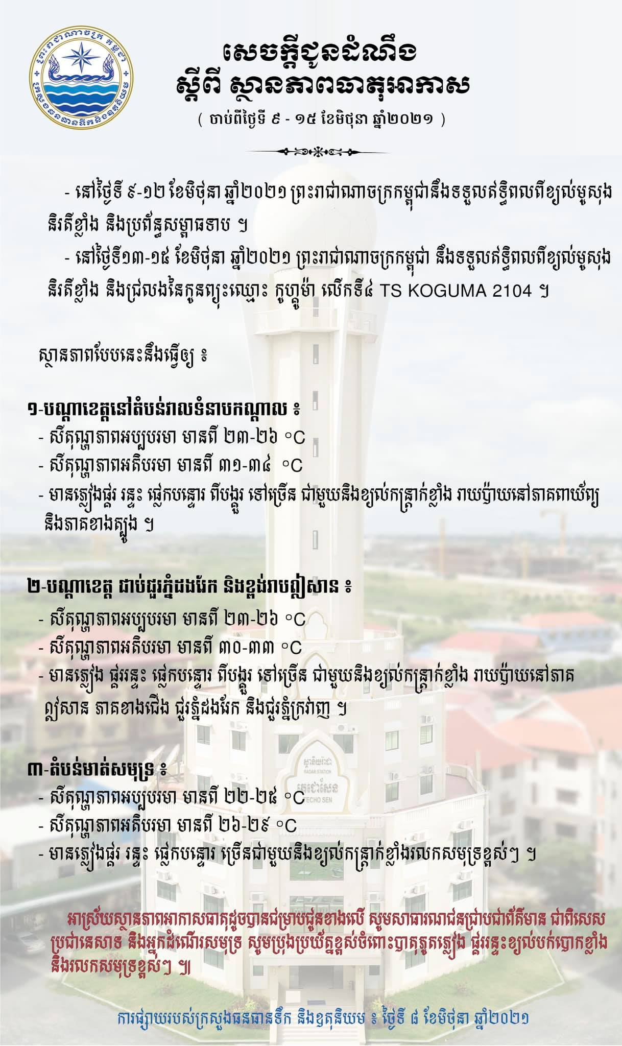យោងតាមការបញ្ជាក់ពីក្រសួងធនធានទឹក និងឧតុនិយម ចាប់ពីថ្ងៃទី៩ – ១២ ខែមិថុនា បានឲ្យដឹងថា នៅថ្ងៃទី ៩ – ១២ ខែមិថុនា ឆ្នាំ២០២១ ព្រះរាជាណាចក្រកម្ពុជានឹងទទួលឥទ្ធិពលពីខ្យល់មូសុងនិរតីខ្លាំង និប្រព័ន្ធសម្ពាធទាប។ ហើយនៅថ្ងៃទី ១៣ – ១៥ ខែមិថុនា ព្រះរាជាណាចក្រកម្ពុជា នឹងទទួលឥទ្ធិពលពីខ្យល់មូសុងនិរតីខ្លាំង និងជ្រលងនៃកូនព្យុះឈ្មោះ កូហ្គូម៉ា លើកទី៤ TS KOGUMA 2104។ ស្ថានភាពបែបនេះនឹងធ្វើឲ្យ៖