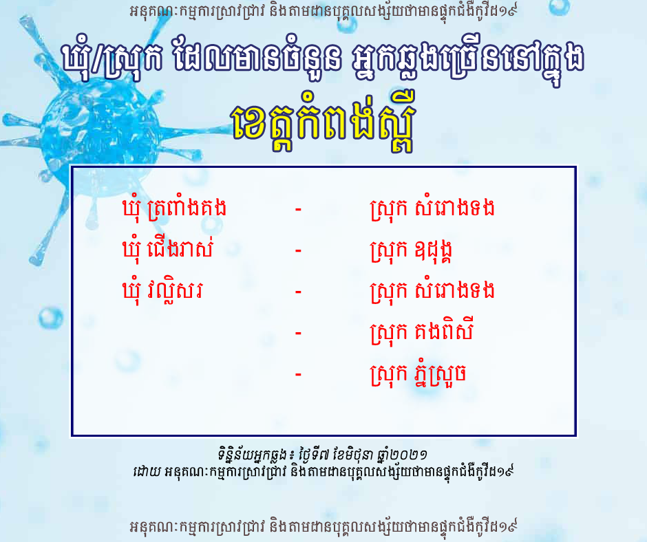 យោងតាមការបញ្ជាក់ពី អនុគណៈកម្មការស្រាវជ្រាវជំងឺកូវីដ១៩ បានធ្វើការបង្ហាញពីឃុំ/ស្រុក ដែលមានអ្នកឆ្លងកូវីដច្រើននៅខេត្តកំពង់ស្ពឺ សម្រាប់ទិន្នន័យឆ្លងថ្ងៃទី៧ ខែមិថុនា ឆ្នាំ២០២១ និងសំណូមពរដល់បងប្អូនប្រជាពលរដ្ឋខេត្តកំពង់ស្ពឺ ដែលរស់នៅក្នុងឃុំ/ស្រុក ទាំងនេះ សូមប្រុងប្រយ័ត្ន​, កុំធ្វេសប្រហែស ​និងសូម​ពាក់ម៉ាស់ រក្សាគម្លាត និងឧស្សាហ៍លាងដៃឲ្យបានខ្ជាប់ខ្ជួន ១០០%។ ឃុំ/ស្រុកទាំងនោះមានដូចជា៖