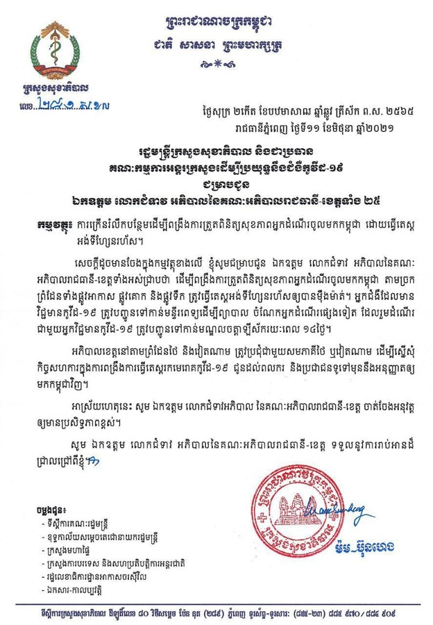 រាជធានីភ្នំពេញ៖ យោងតាមសារលិខិតរបស់ ក្រសួងសុខាភិបាល បានឲ្យដឹងថា នៅថ្ងៃទី១២ ខែមិថុនា ឆ្នាំ២០២១ រដ្ឋមន្ត្រីក្រសួងសុខាភិបាល និងប្រធានគណៈកម្មការអង្គរក្រសួង ដើម្បីប្រយុទ្ធនឹងជំងឺកូវីដ-១៩ ជម្រាបជូនឯកឧត្តម លោកជំនាវ អភិបាលនៃគណៈអភិបាលរាជធានី-ខេត្តទាំង ២៥ ឲ្យបានជ្រាបថា៖