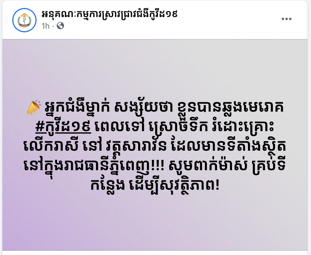 យោងតាមការបញ្ជាក់ពី អនុគណៈកម្មការស្រាវជ្រាវជំងឺកូវីដ១៩ នាថ្ងៃទី១២ ខែមិថុនា ឆ្នាំ២០២១ នេះ បានឲ្យដឹងថា មានអ្នកជំងឺម្នាក់សង្ស័យថា ខ្លួនបានឆ្លងមេរោគកូវីដ១៩ ពេលទៅស្រោចទឹករំដោះគ្រោះ លើករាសី នៅវត្តសារាវ័ន ដែលមានទីតាំងស្ថិតនៅក្នុងរាជធានីភ្នំពេញ!!! សូមពាក់ម៉ាស់ គ្រប់ទីកន្លែង ដើម្បីសុវត្ថិភាព!
