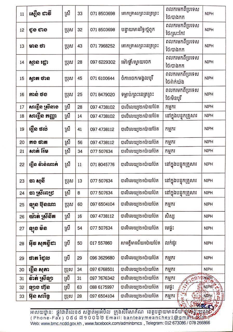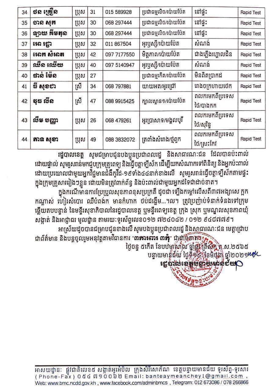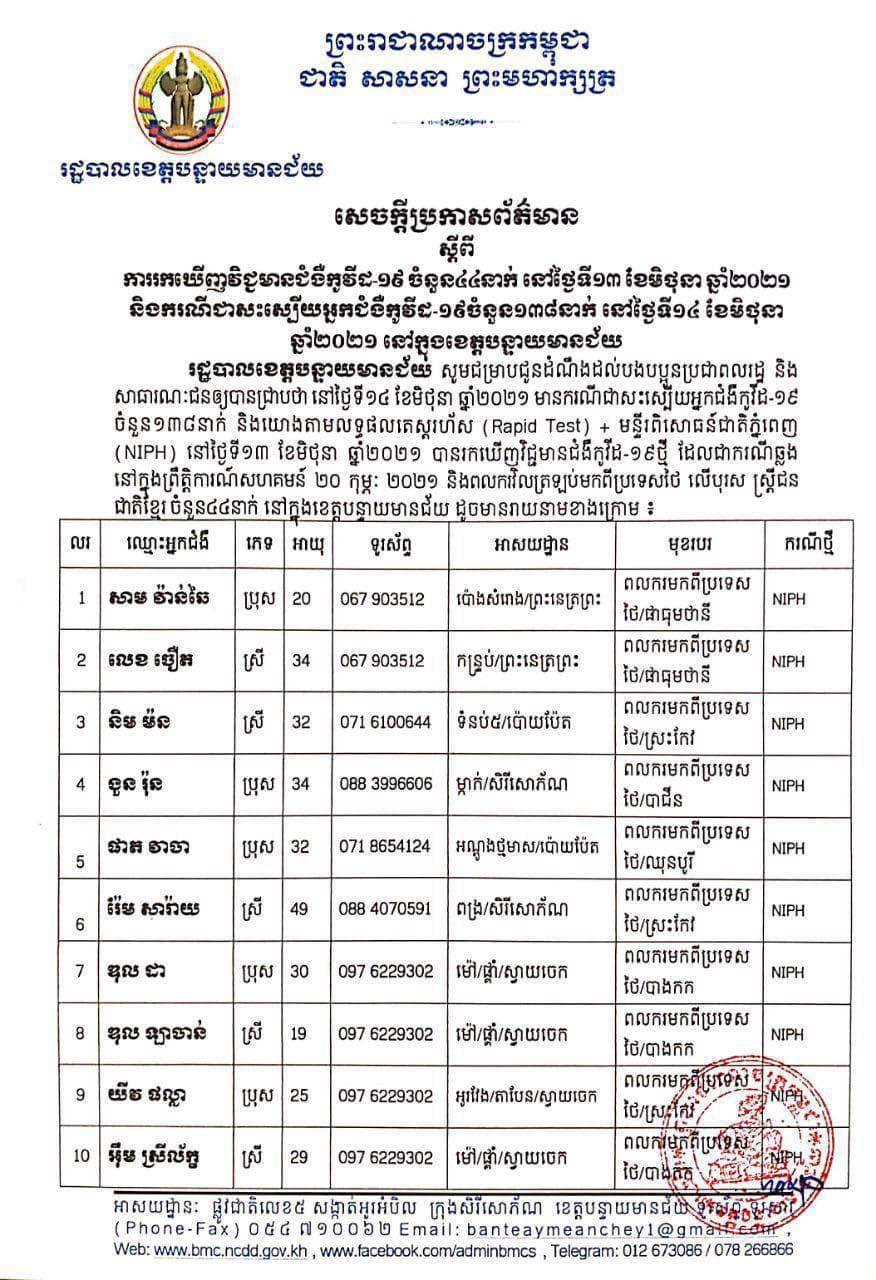 សូមបញ្ជាក់ផងដែរថា នៅថ្ងៃទី១៣ ខែមិថុនា ឆ្នាំ២០២១ រដ្ឋបាលខេត្ត បានរកឃើញវិជ្ជមានជំងឺកូវីដ-១៩ថ្មី ដែលជាករណីឆ្លងនៅក្នុងព្រឹត្តិការណ៍សហគមន៍ ២០កុម្ភៈ ២០២១ និងពលករវិលត្រឡប់មកពីប្រទេសថៃ លើបុរស ស្ត្រីជនជាតិខ្មែរ ចំនួន ៤៤នាក់ នៅក្នុងខេត្តបន្ទាយមានជ័យ ដូចមានរាយនាមខាងក្រោម៖