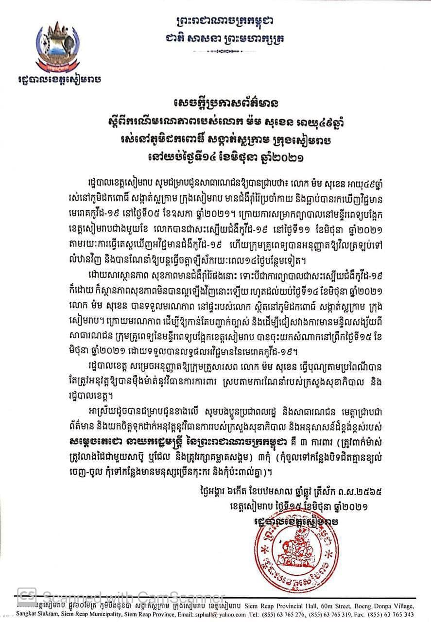 យោងតាមការបញ្ជាក់ពី រដ្ឋបាលខេត្តសៀមរាប បានឲ្យដឹងថា រដ្ឋបាលខេត្តសៀមរាប សូមជម្រាបជូនសាធារណជនឱ្យបានជ្រាបថា៖ លោក ម៉ម សុខេន អាយុ៤៩ឆ្នាំ រស់នៅភូមិដកពោធិ៍ សង្កាត់ស្លក្រាម ក្រុងសៀមរាប មានជំងឺរុំារ៉ៃប្រចាំកាយ និងធ្លាប់បានរកឃើញវិជ្ជមានមេរោគកូវីដ-១៩ នៅថ្ងៃទី០៥ ខែឧសភា ឆ្នាំ២០២១។ ក្រោយការសម្រាកព្យាបាលនៅមន្ទីរពេទ្យបង្អែកខេត្តសៀមរាបជាងមួយខែ លោកបានជាសះស្បើយជំងឺកូវីដ-១៩ នៅថ្ងៃទី១១ ខែមិថុនា ឆ្នាំ២០២១ តាមរយៈការធ្វើតេស្តឃើញអវិជ្ជមានជំងឺកូវីដ-១៩ ហើយក្រុមគ្រូពេទ្យបានអនុញ្ញាតឱ្យវិលត្រឡប់ទៅលំឋានវិញ និងបានណែនាំឱ្យបន្តធ្វើចត្តាឡីស័ករយៈពេល១៤ថ្ងៃបន្ថែមទៀត។