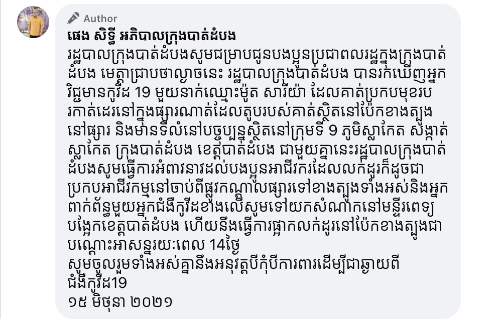 ជាមួយគ្នានេះរដ្ឋបាលក្រុងបាត់ដំបងសូមធ្វើការអំពាវនាវដល់បងប្អូនអាជីវករដែលលក់ដូរក៏ដូចជាប្រកបអាជីវកម្មនៅចាប់ពីផ្លូវកណ្ដាលផ្សារទៅខាងត្បូងទាំងអស់និងអ្នកពាក់ព័ន្ធមួយអ្នកជំងឺកូវីដខាងលើសូមទៅយកសំណាកនៅមន្ទីរពេទ្យបង្អែកខេត្តបាត់ដំបង ហើយនឹងធ្វើការផ្អាកលក់ដូរនៅប៉ែកខាងត្បូងជាបណ្ដោះអាសន្នរយៈពេល ១៤ថ្ងៃ៕