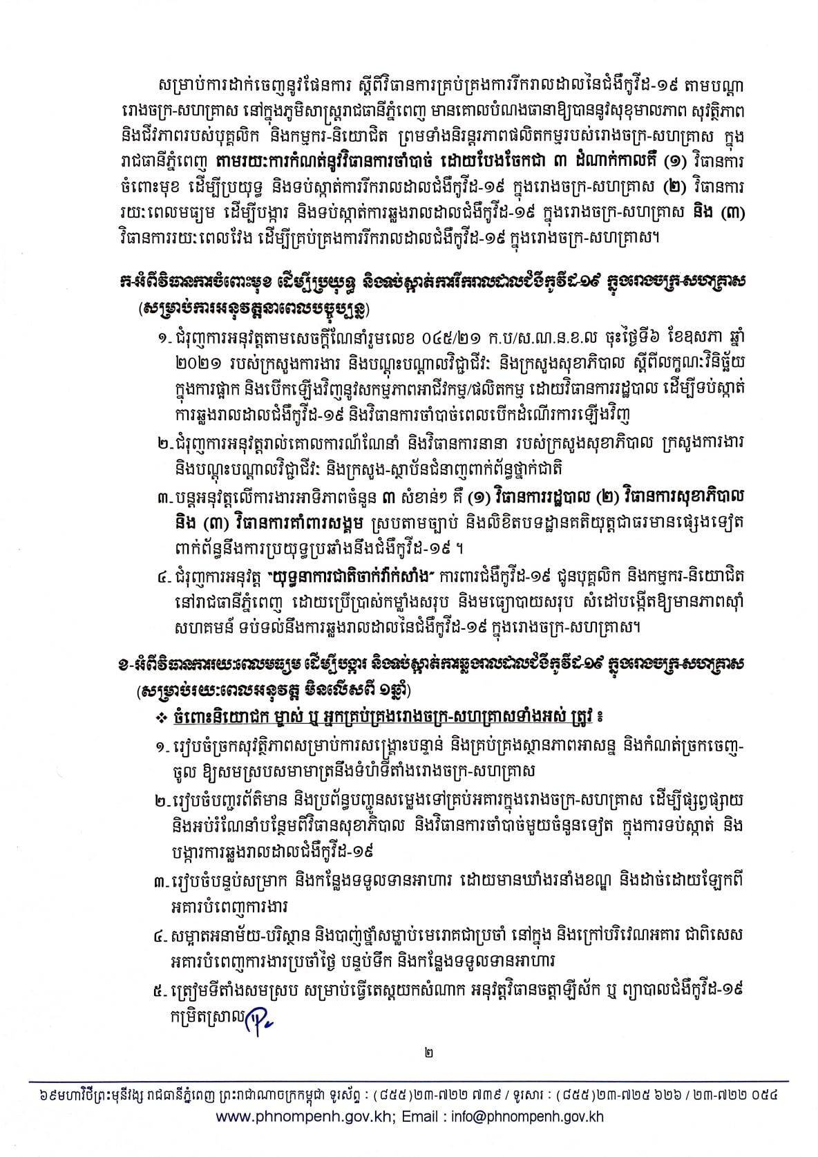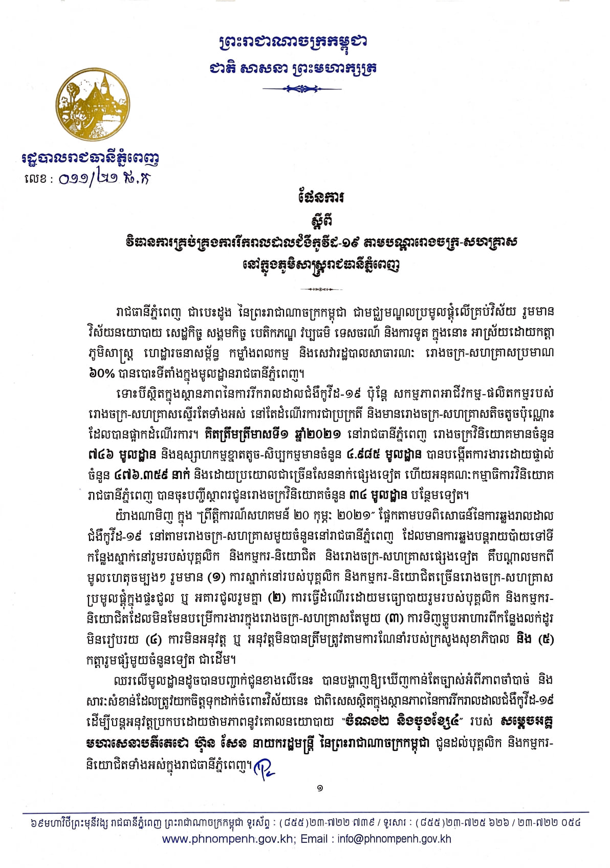 ចាប់តាំងពីមានករណី “ព្រឹត្តិការណ៍សហគមន៍ ២០ កុម្ភៈ ២០២១” មក យើងសង្កេតឃើញមានការឆ្លងរីករាលដាលយ៉ាងច្រើននៅតាមបណ្តារោងចក្រ និងសហគ្រាសនៅក្នុងរាជធានីភ្នំពេញ ដែលតម្រូវឲ្យរោងចក្រ-សហគ្រាសទាំងនោះត្រូវផ្អាកដំណើរការមួយរយៈ។