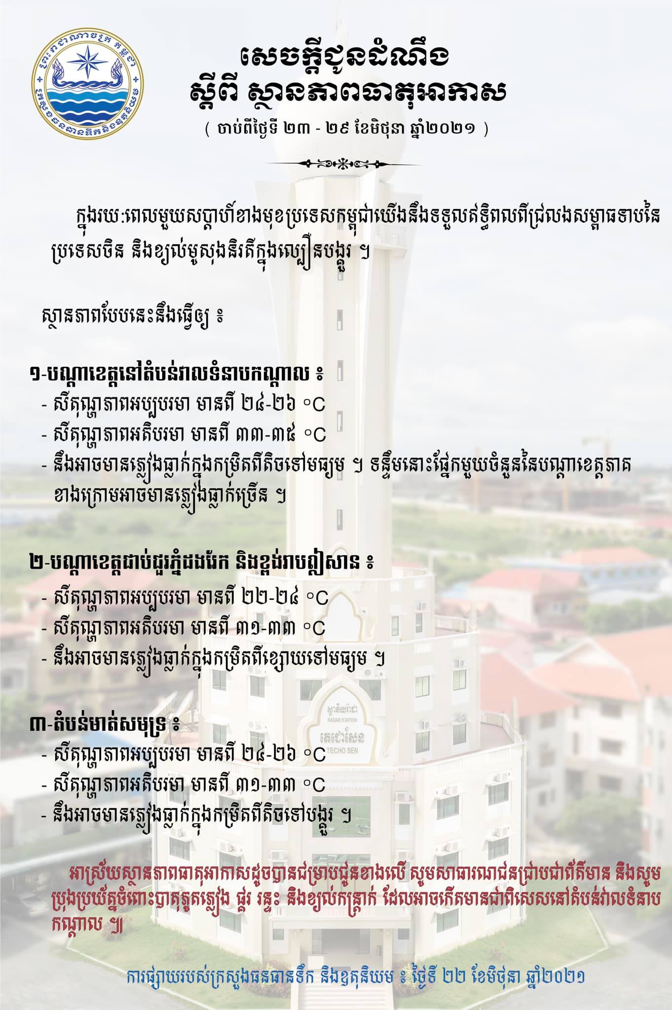 យោងតាមការបញ្ជាក់ពីក្រសួងធនធានទឹក និងឧតុនិយម ចាប់ពីថ្ងៃទី២៣ ដល់ថ្ងៃទី២៩ ខែមិថុនា បានឲ្យដឹងថា ក្នុងរយៈពេលមួយសប្តាហ៍ខាងមុខប្រទេសកម្ពុជាយើងនឹងទទួលឥទ្ធិពលពីជ្រលងសម្ពាធទាបនៃប្រទេសចិន និងខ្យល់មូសុងនិរតីក្នុងល្បឿនបង្គួរ។ ស្ថានភាពបែបនេះនឹងធ្វើឲ្យ៖