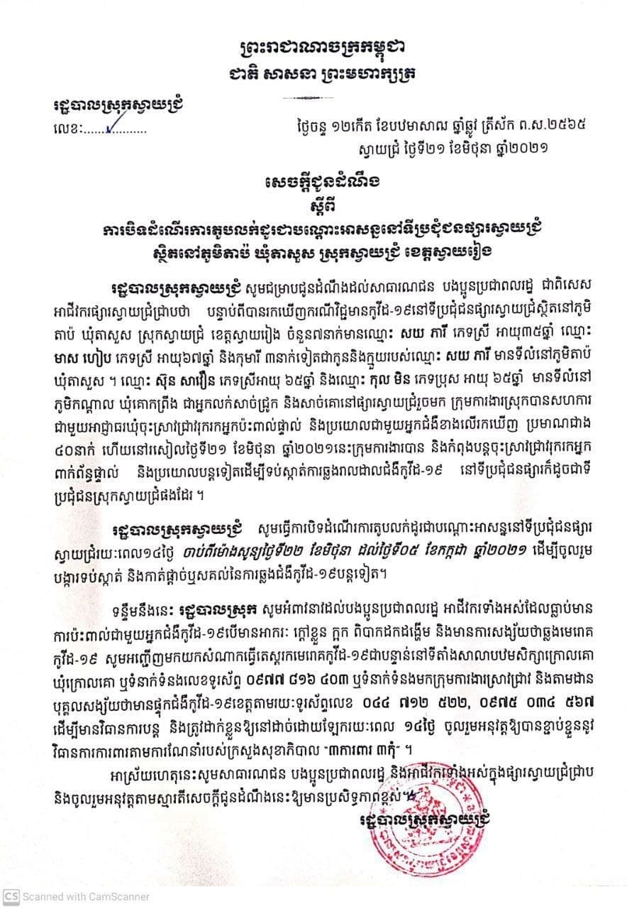 ខេត្តស្វាយរៀង៖ យោងតាមការចុះផ្សាយរបស់ រដ្ឋបាលខេត្តស្វាយរៀង បានចេញសេចក្តីជូនដំណឹង ស្តីពីការបិទដំណើរការតូបលក់ដូរជាបណ្តោះអាសន្ននៅទីប្រជុំជនផ្សារស្វាយជ្រំ ស្ថិតនៅភូមិតាប៉ ឃុំតាសួស ស្រុកស្វាយជ្រំ ខេត្តស្វាយរៀង រយៈពេល១៤ថ្ងៃ គិតពីម៉ោង សូន្យ ថ្ងៃទី២២ ខែមិថុនា ដល់ថ្ងៃទី០៥ ខែកក្កដា ឆ្នាំ២០២១ ដើម្បីទប់ស្កាត់ការឆ្លងរីករាលដាលនៃជំងឺកូវីដ-១៩ ចូលក្នុងសហគមន៍។