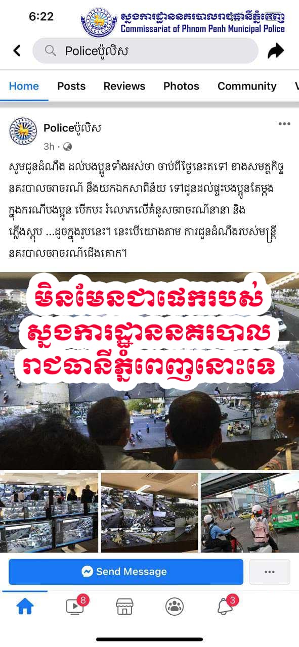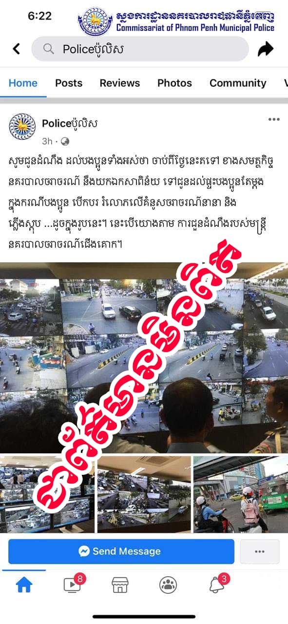 ស្នងការរាជធានីភ្នំពេញកំពុងស្រាវជ្រាវរកម្ចាស់ផេក “Police ប៉ូលិស“ ដែលផ្សាយព័ត៌មានមិនពិតបែបនេះ