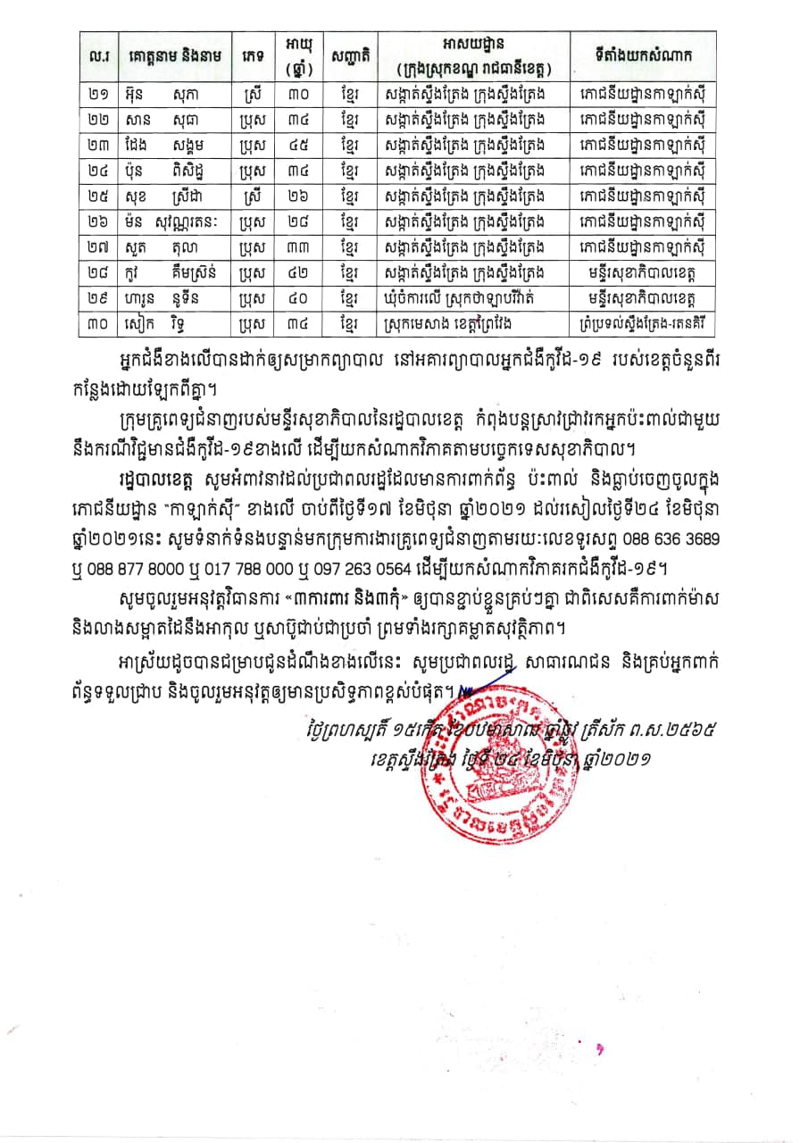 ខេត្តស្ទឹងត្រែង៖ យោងតាមការបញ្ជាក់ពី រដ្ឋបាលខេត្តស្ទឹងត្រែង បានឲ្យដឹងថា គិតត្រឹមម៉ោង ០៩ និង៣០នាទីថ្ងៃទី២៤ ខែមិថុនា ឆ្នាំ២០២១នេះ ក្រុមគ្រូពេទ្យជំនាញរបស់មន្ទីរសុខាភិបាលនៃរដ្ឋបាលខេត្តស្ទឹងត្រែង ប្រចាំនៅគោលដៅចំណុចព្រំប្រទល់ខេត្ត និងប្រចាំការឆ្លើយតបបន្ទាន់តាមគោលដៅគ្រប់ខេត្ត បានពិនិត្យសុខភាពនិងយកសំណាកវិភាគរហ័សចំពោះអ្នកសង្ស័យពាក់ព័ន្ធជំងឺកូវីដ១៩ ដែលបានធ្វើដំណើរមកពីរាជធានីភ្នំពេញ បណ្ដាខេត្តផ្សេងៗដែលមានករណីផ្ទុះជំងឺកូវីដ១៩ ។